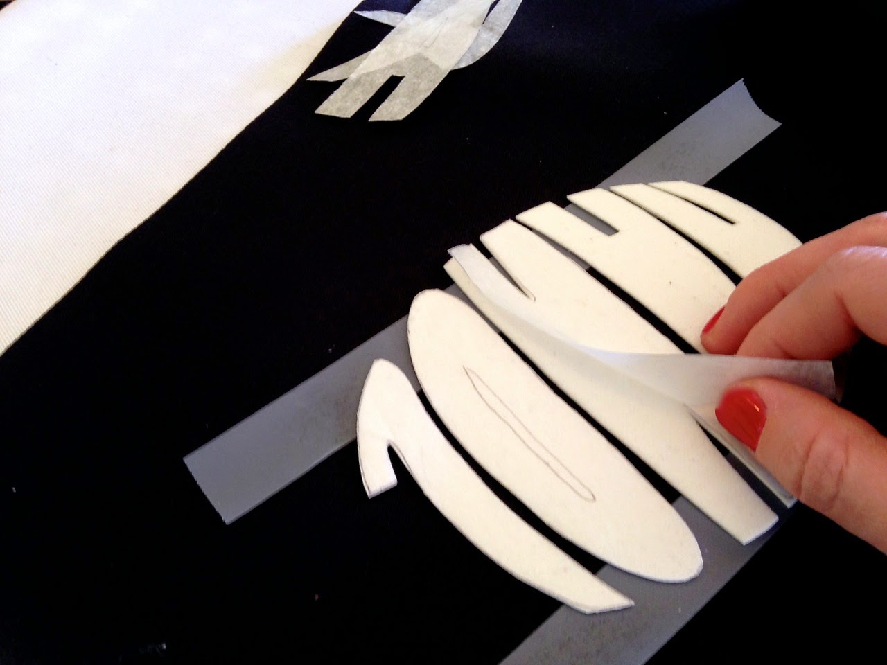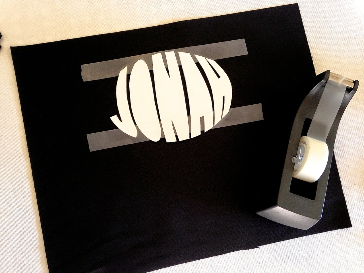 Arrange your letters over the front (rightside) of your bag. Once you have them arranged how you want them to look, carefully place 2 pieces of scotch tape across the top and bottom edges of your letters to keep them in place.