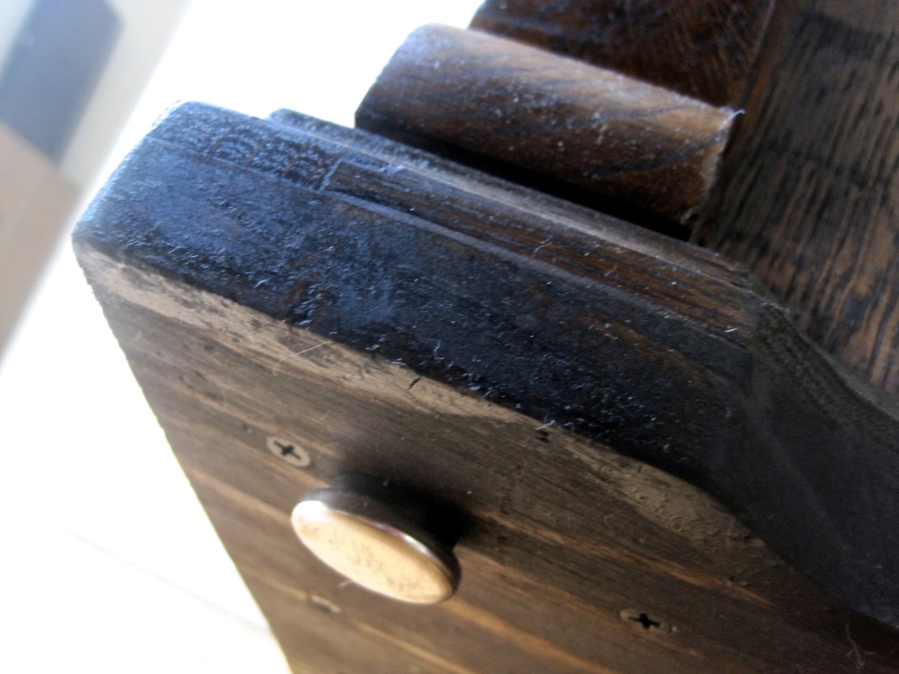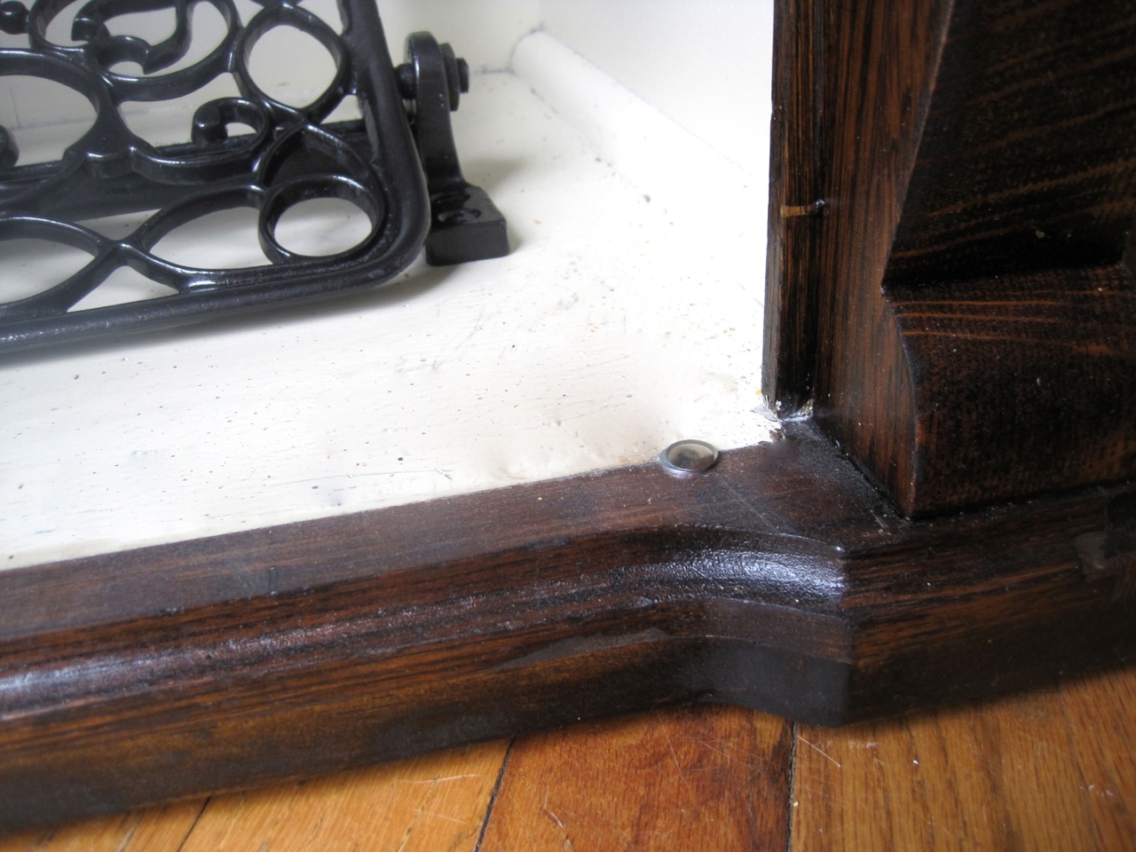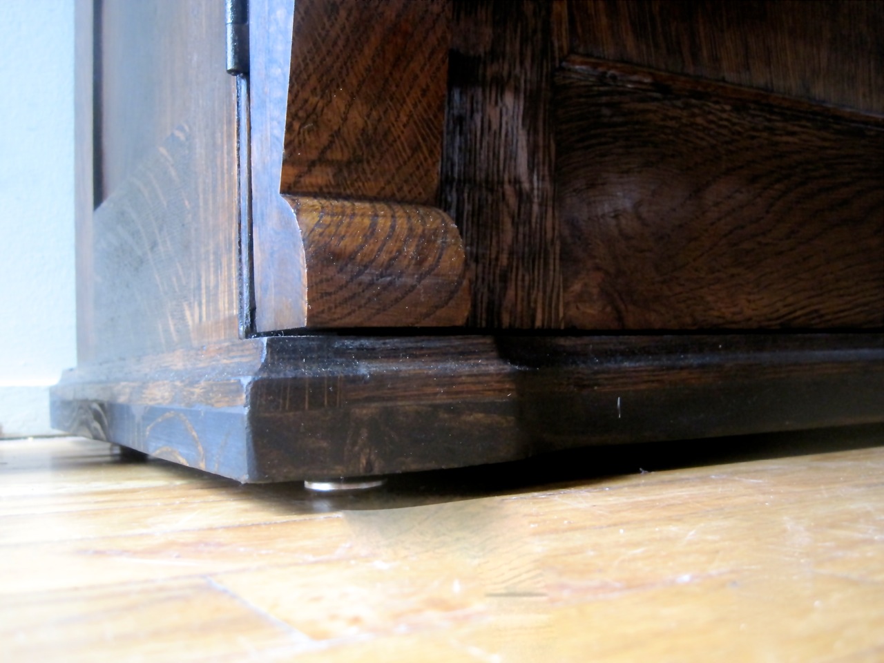 This shows the bottom corner with the new bottom added and the metal slides I put on the bottom instead of the wheels it had before.