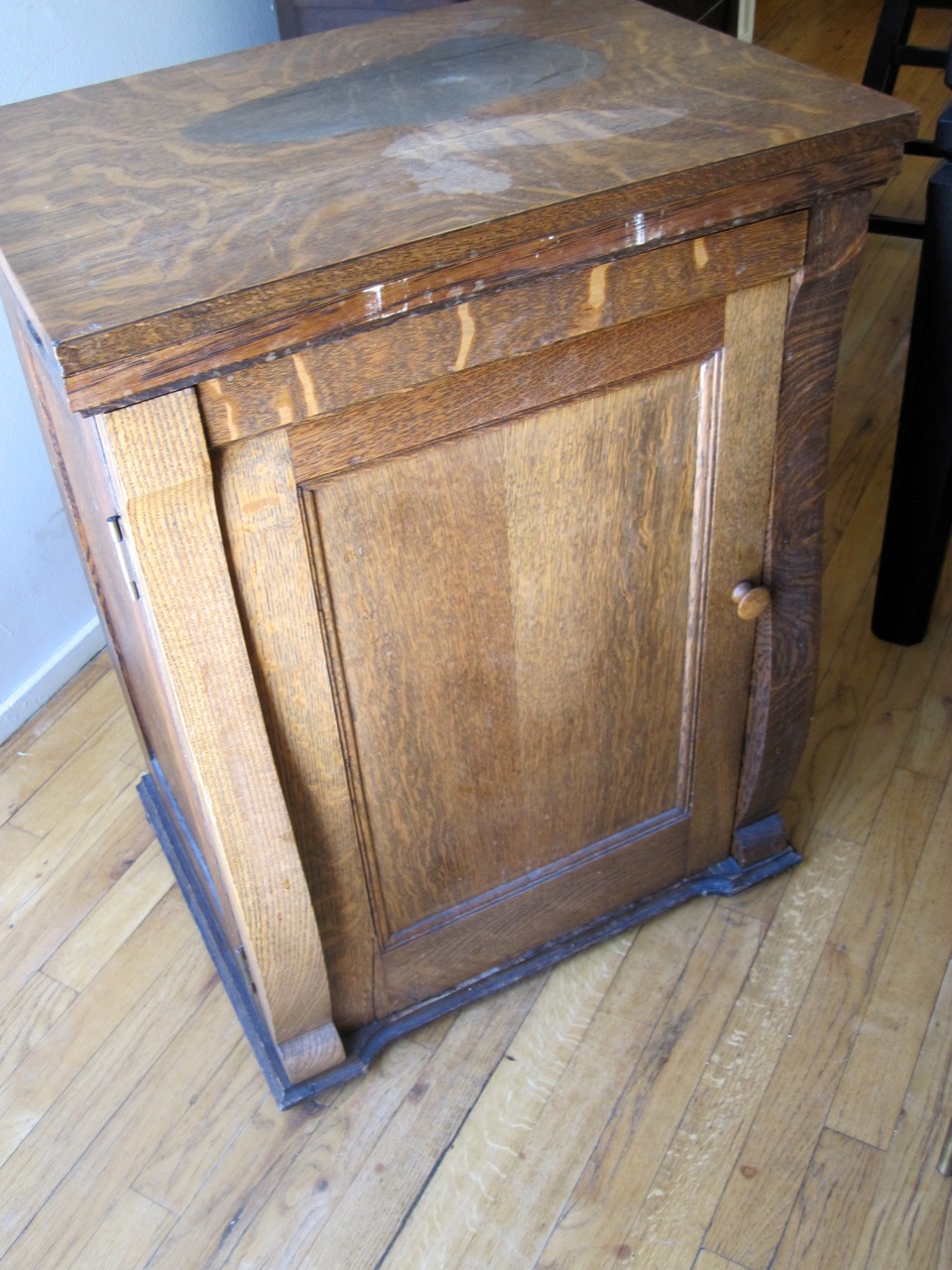 The machine itself was in beautiful condition, hardly a scratch and no rust whatsoever which is pretty rare. The cabinet however was showing it’s 100 years (born in 1913) on the surface. The door had a large crack stemming from the bottom half-way up. The door would fall open with nothing to hold it shut.