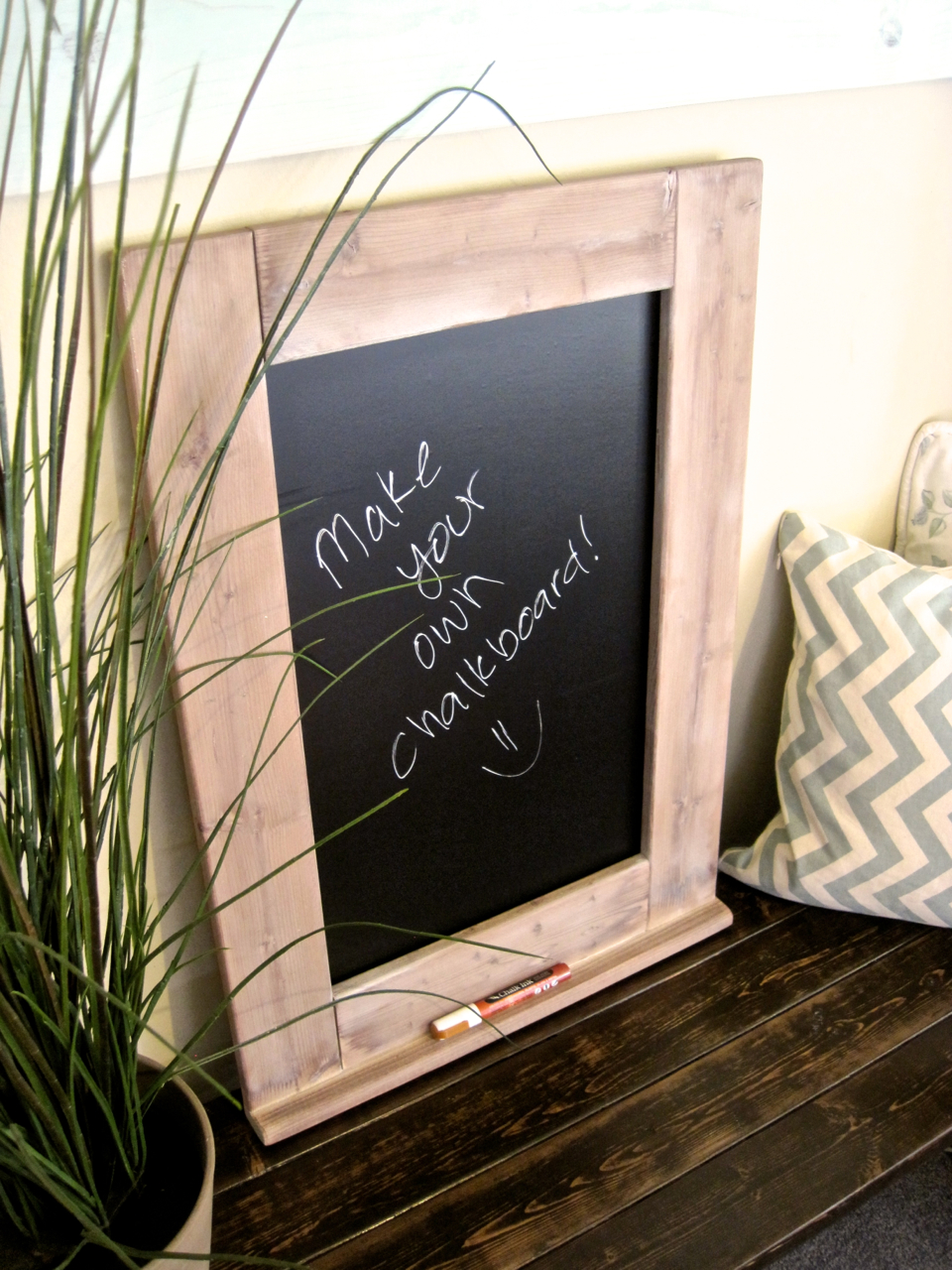 I’ve been wanting a chalkboard but had no idea where to actually get the chalkboard part of a chalkboard. I found some ‘contact paper’ on Amazon.com that is chalkboard paper – just stick it to whatever surface you want! That’s all I needed to get building. Even better, I had everything else on hand that I needed (don’t you just love that!?)! Approximate cost breakdown – chalkboard paper $8, boards $6, hardware $5 = $19.