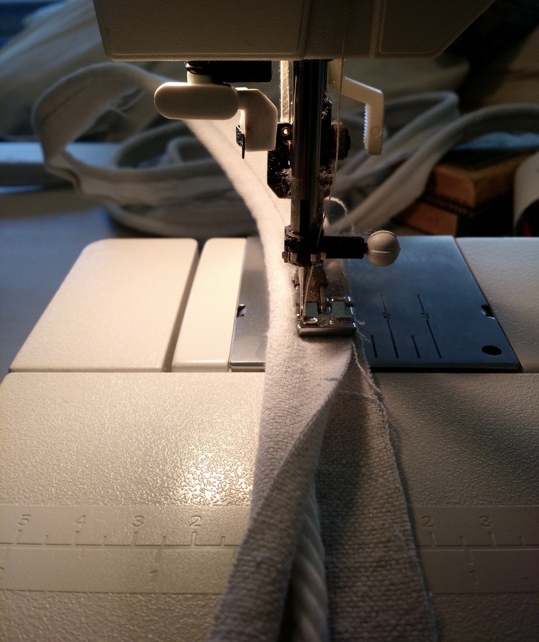 Here I’m sewing the border strip onto the bottom piece. TIP: use a foot that allows you to get the needle close to the piping underneath.
