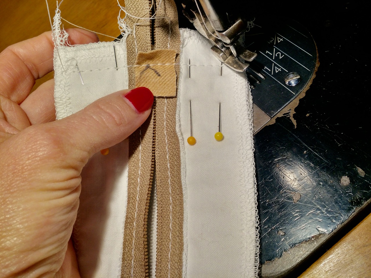 The lines of purple along the zipper show where the stitch goes up and crosses at your original-basted stitch on the other end over the end of zipper. That sounds confusing. It’s not, I promise!