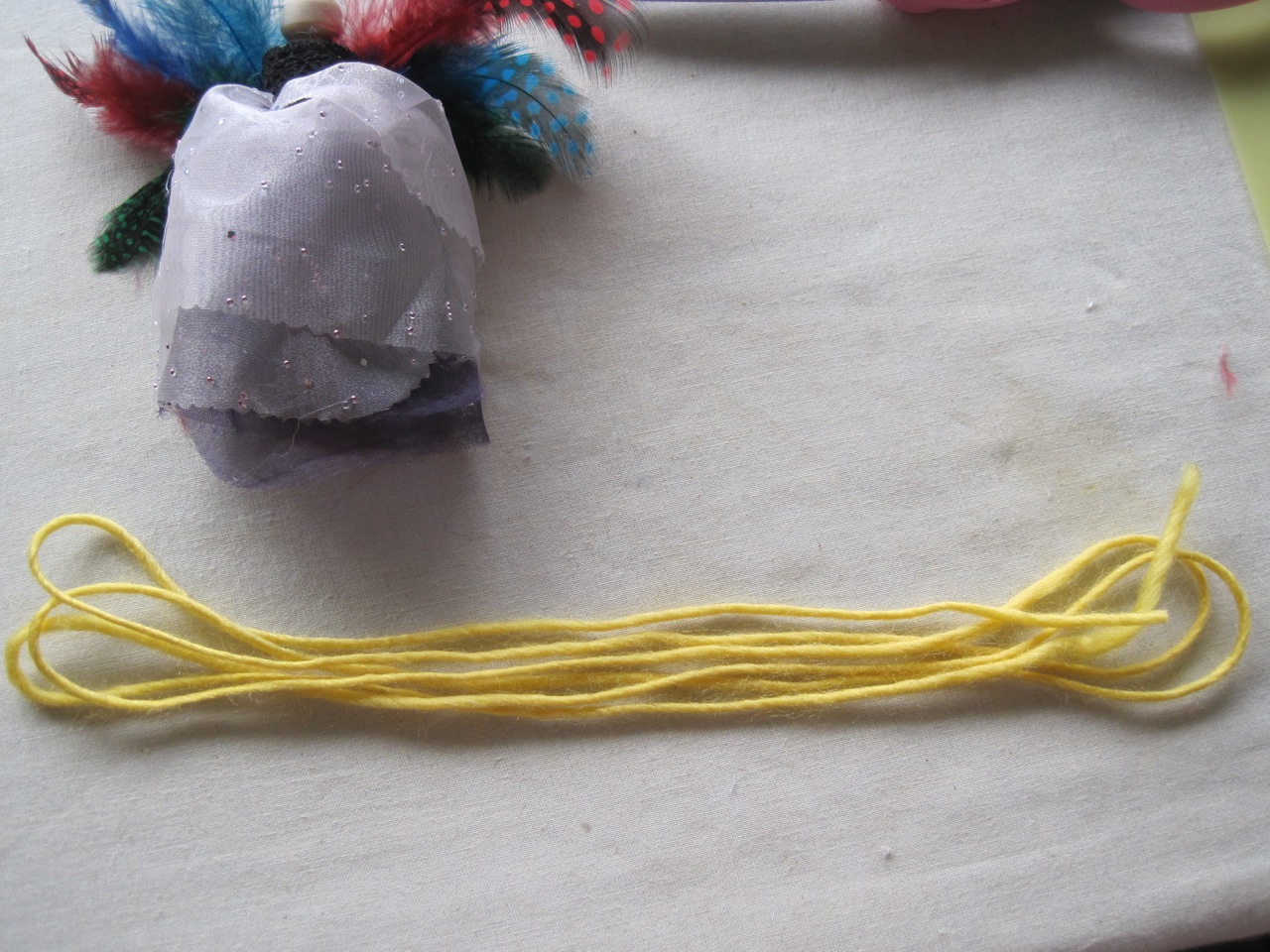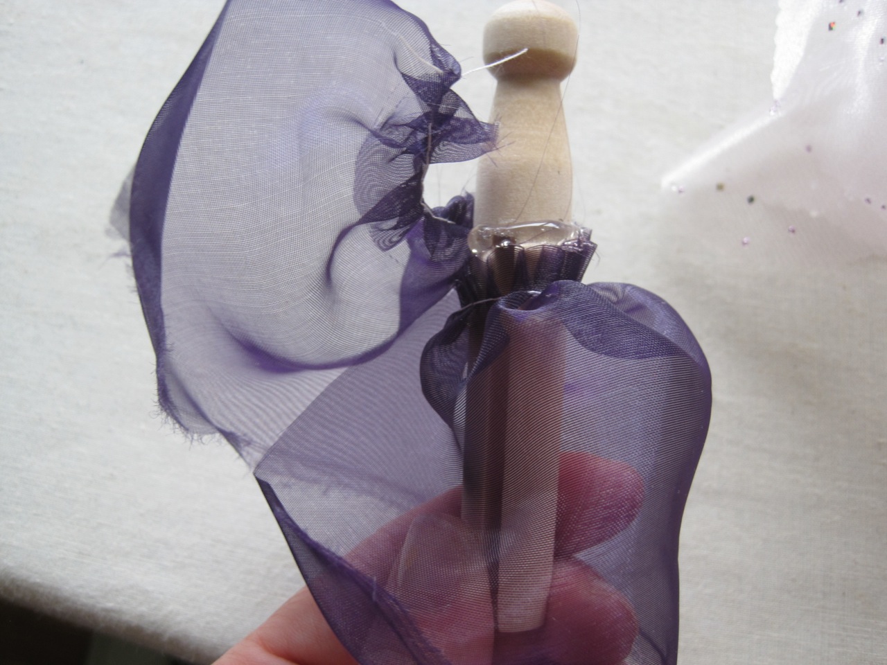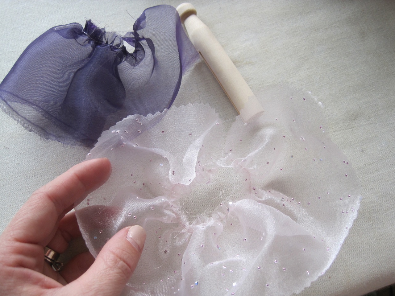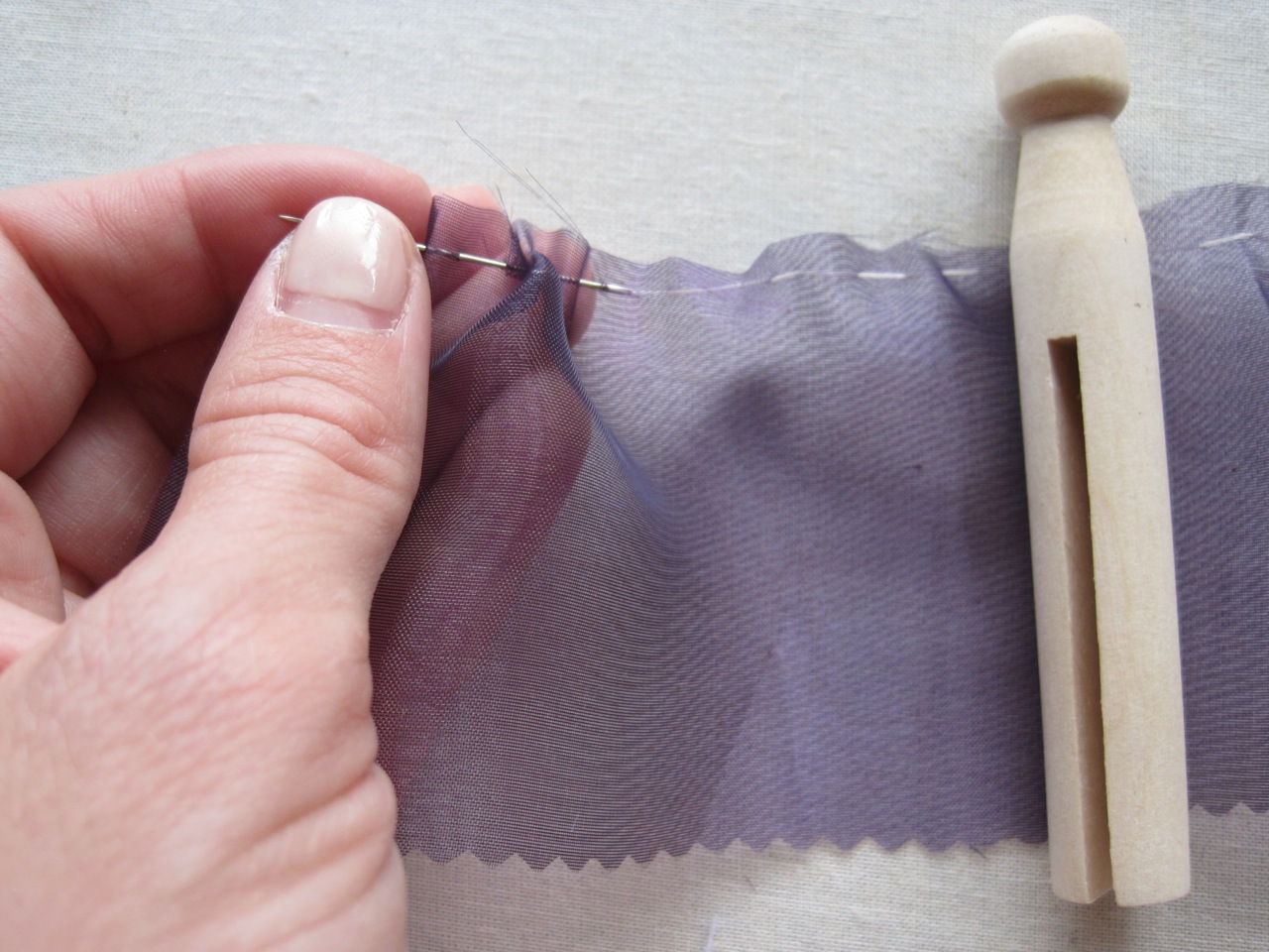 For a fluffy skirt cut your fabric to the height you want it on your clothespin. Take your needle and thread and sew long stitches on the top.