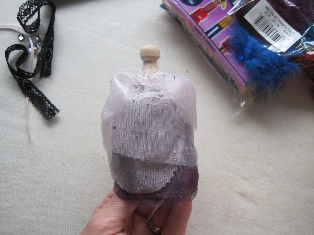 Glue skirt around clothespin, barely overlapping top edges.. just keep spiraling up!