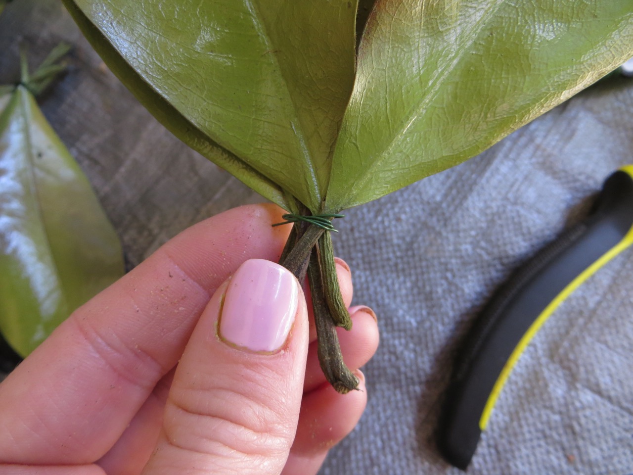 Cut floral wire pieces to about 4-inches long and wrap tightly around the base of your leaf groups. You’ll want to hold the leaves splayed out the best you can with one hand while using your other hand to wrap the wire around and around.