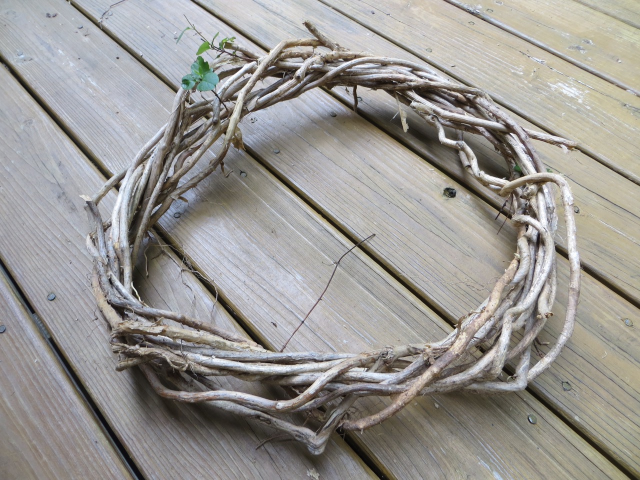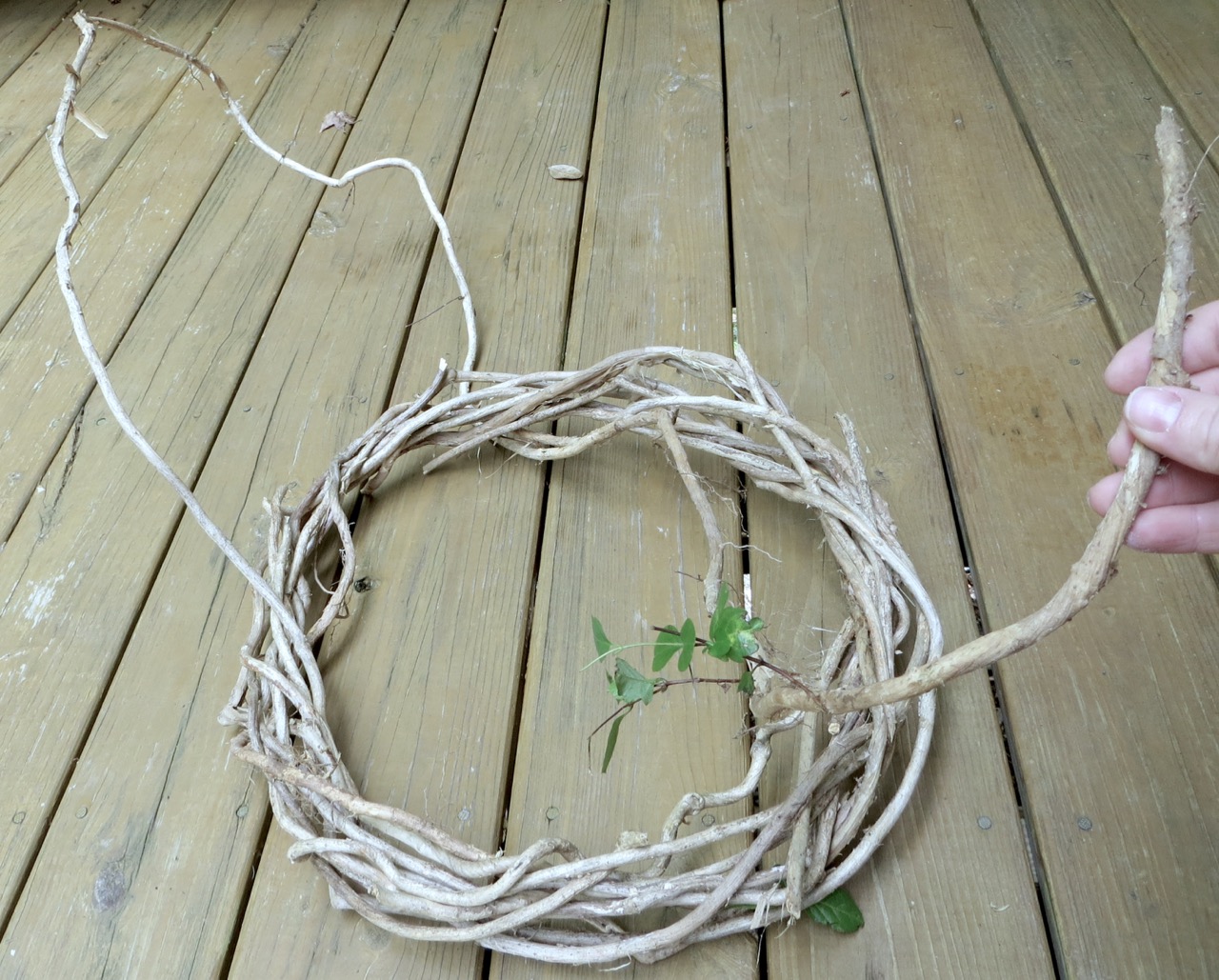 I started by wrapping a few circles in the shape I wanted then I started twisting other pieces around the circle. It was tricky at first but I found the best way to keep the vines from snapping was to go slowly and grab the end and pull it through the center, grab the end and pull it through, etc.