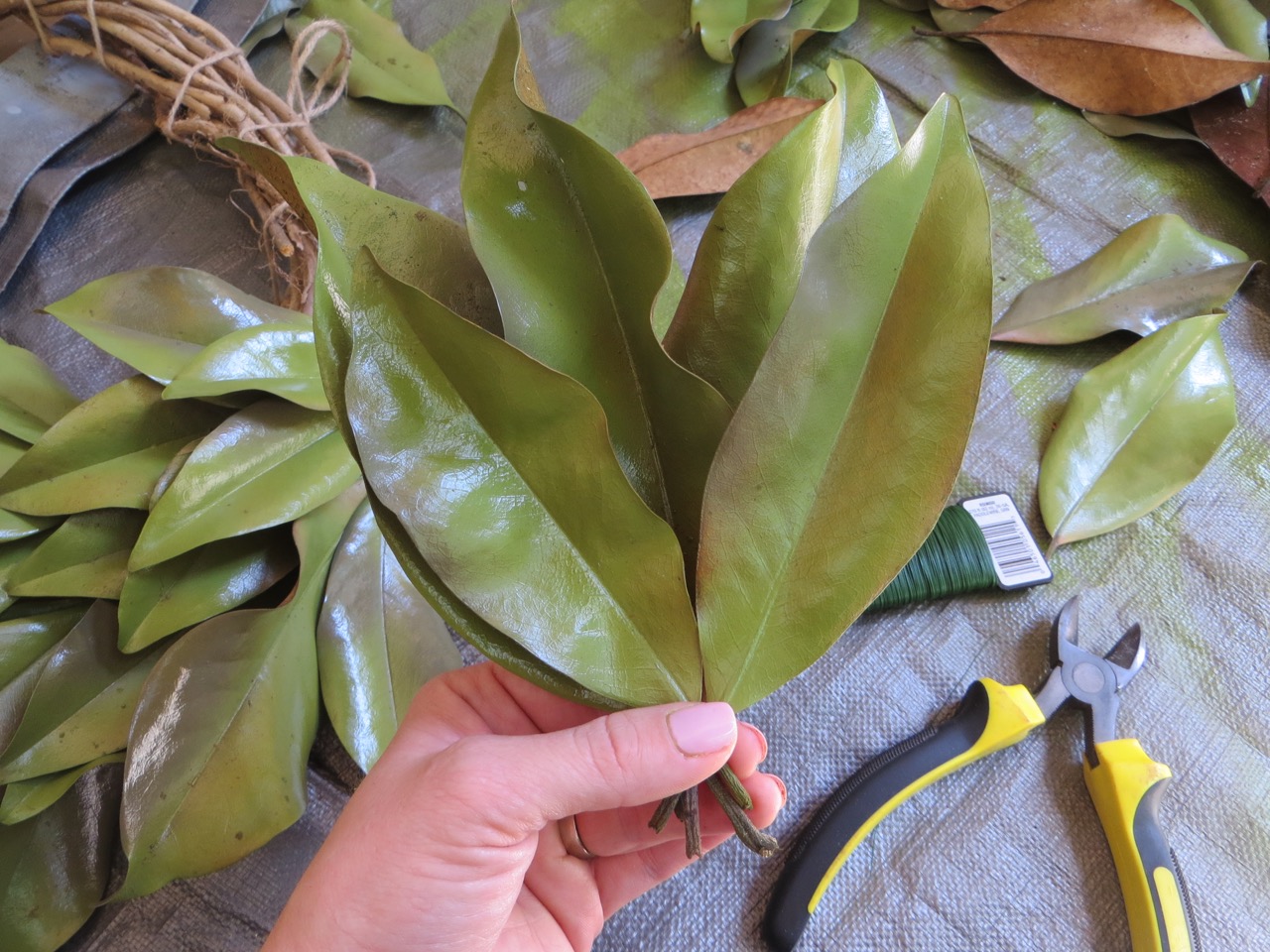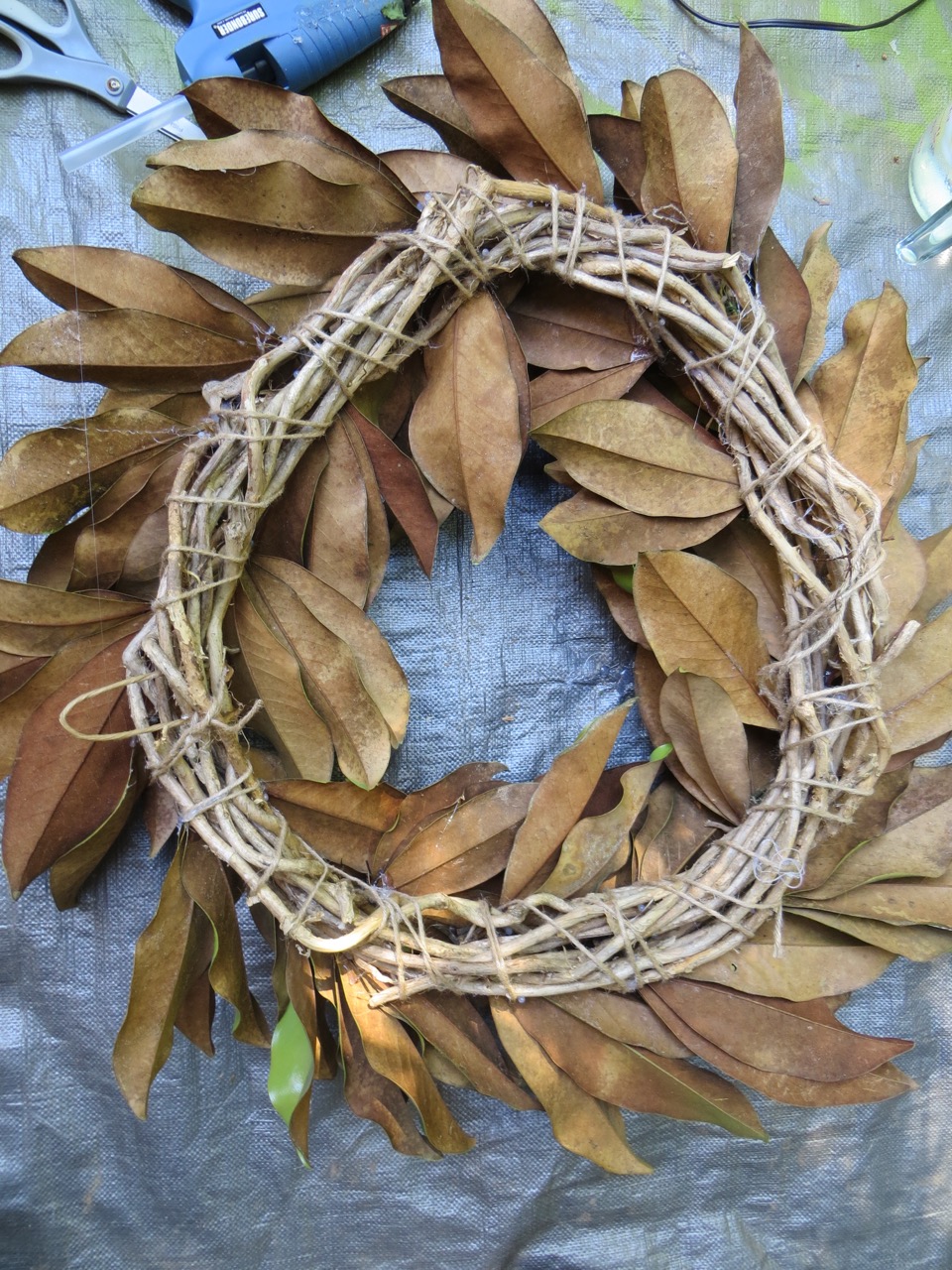 TIP: whether you’re buying or making your own frame you’ll want it to be large (say, 14-inches across the center opening) because not only is it hard to twist vines in a smaller circle BUT more importantly the magnolia leaves are very large and would be hard to fit inside the inner curve.