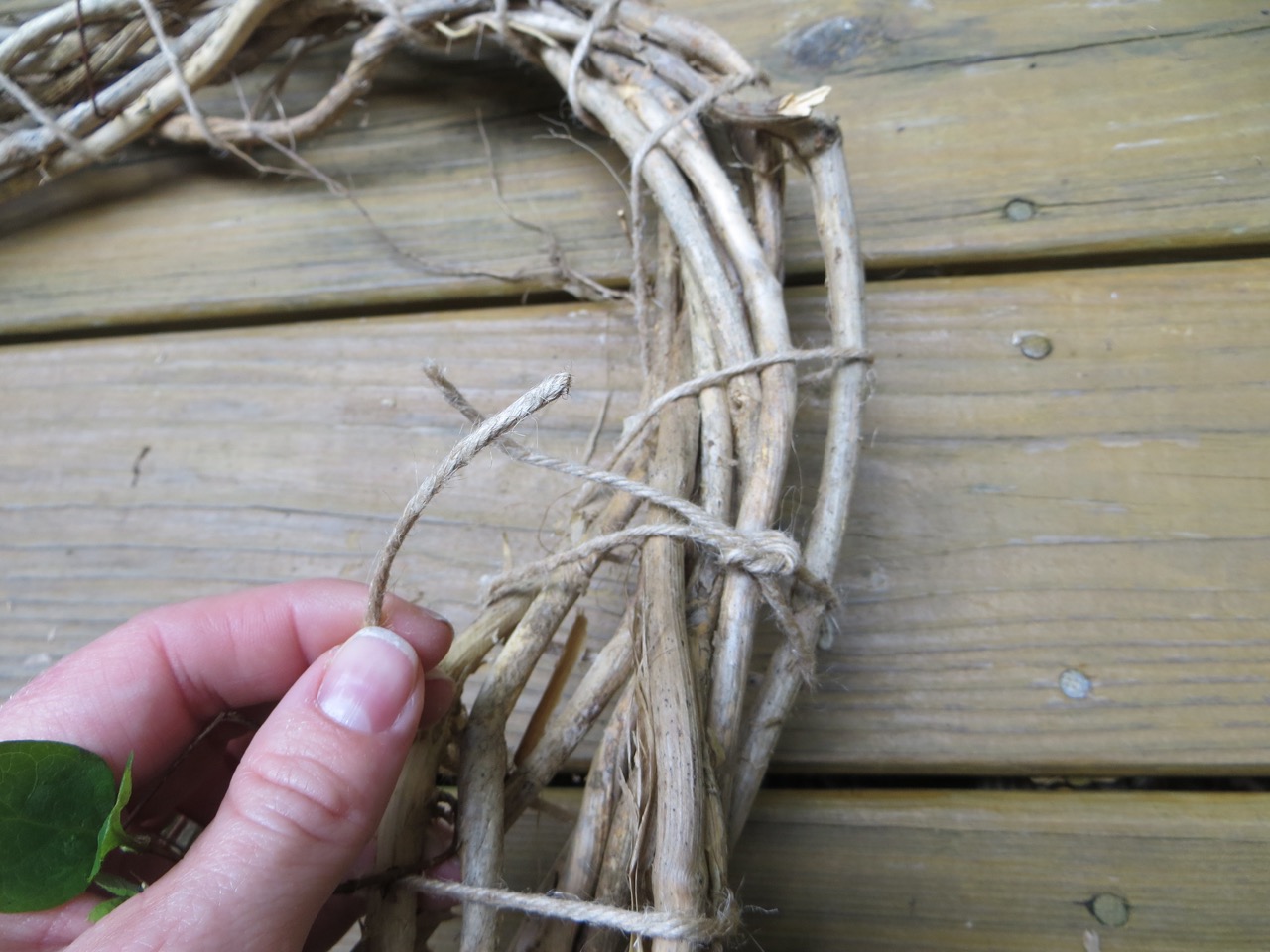 There were a dozen or so ends of vine that I needed to keep from popping out so I wrapped the twine around and around, pulling tight as I went. It’s a wonky-shaped frame but I wasn’t trying to make it perfect since the leaves would hide most of it.