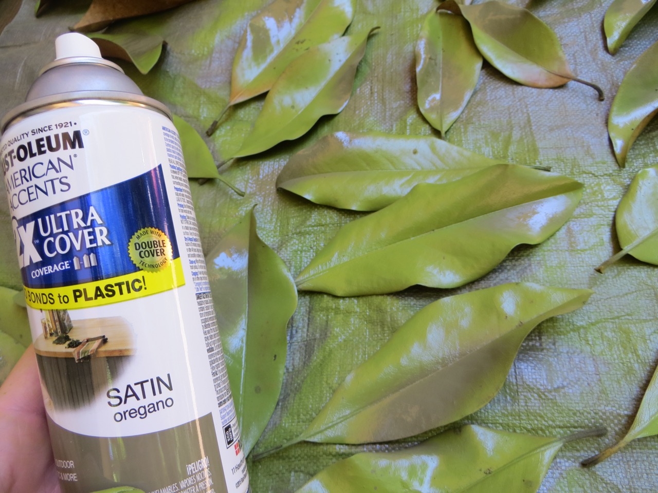 Lay your leaves out on a large surface – I keep an old tarp handy for spray-painting projects. These are the 2 colors I purchased and they were just right!