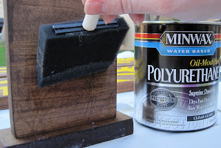 Follow the directions off the back of the polyurethane. I’ve found it best to use a foam brush rather then a regular brush because it doesn’t leave as many streaks.