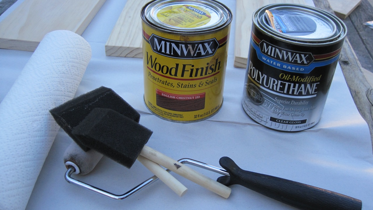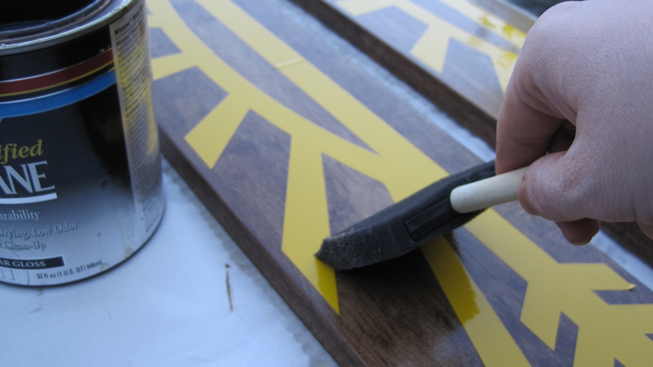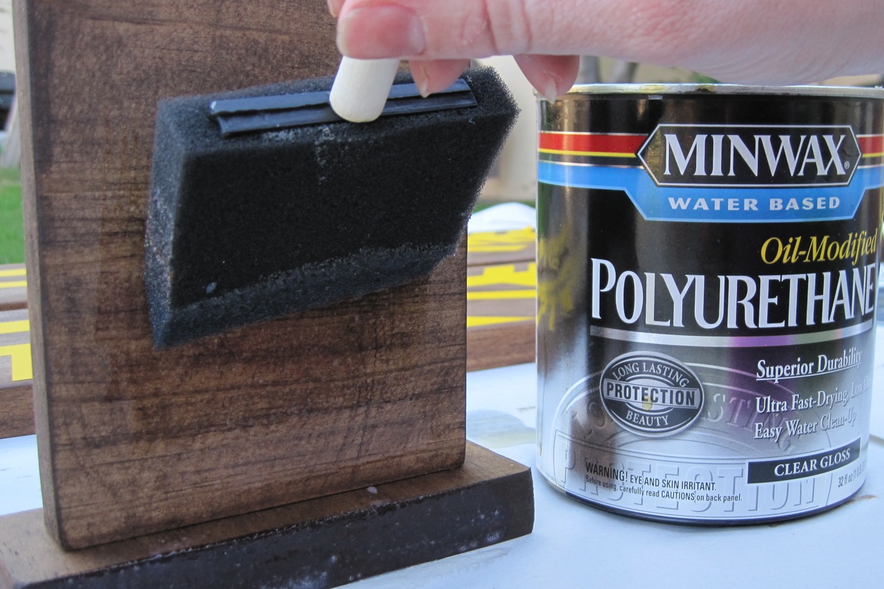 Follow the directions off the back of the polyurethane. I’ve found it best to use a foam brush rather then a regular brush because it doesn’t leave as many streaks.
