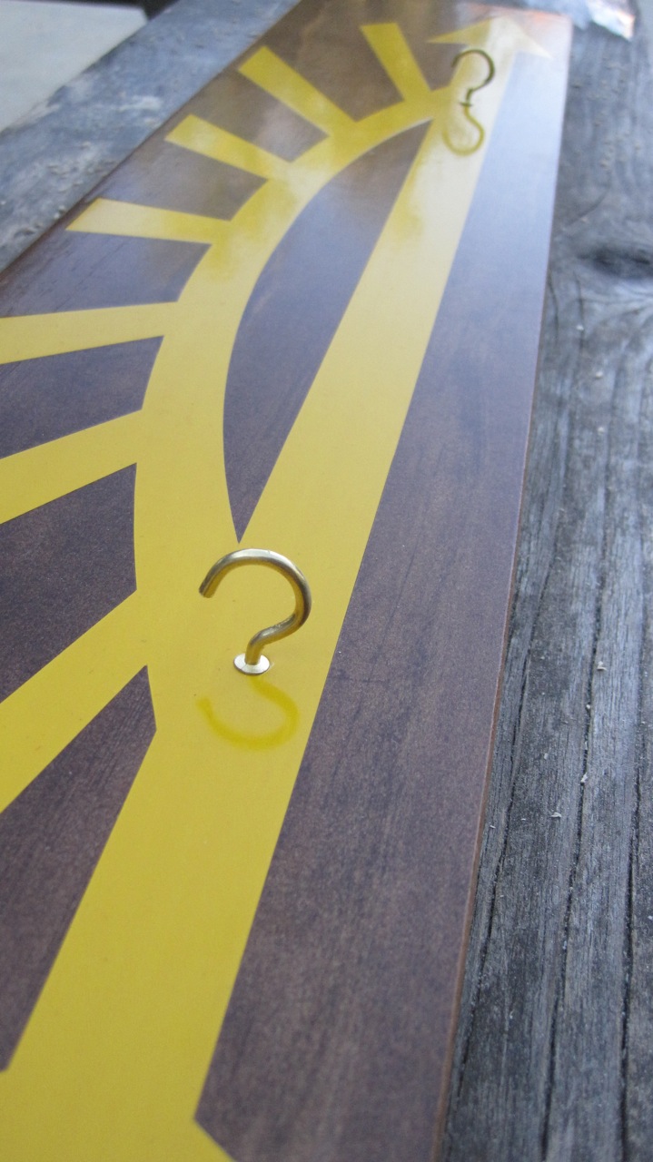 ARROW OF LIGHT: Drill two holes through the center of the vinyl arrow and screw cup hooks in.