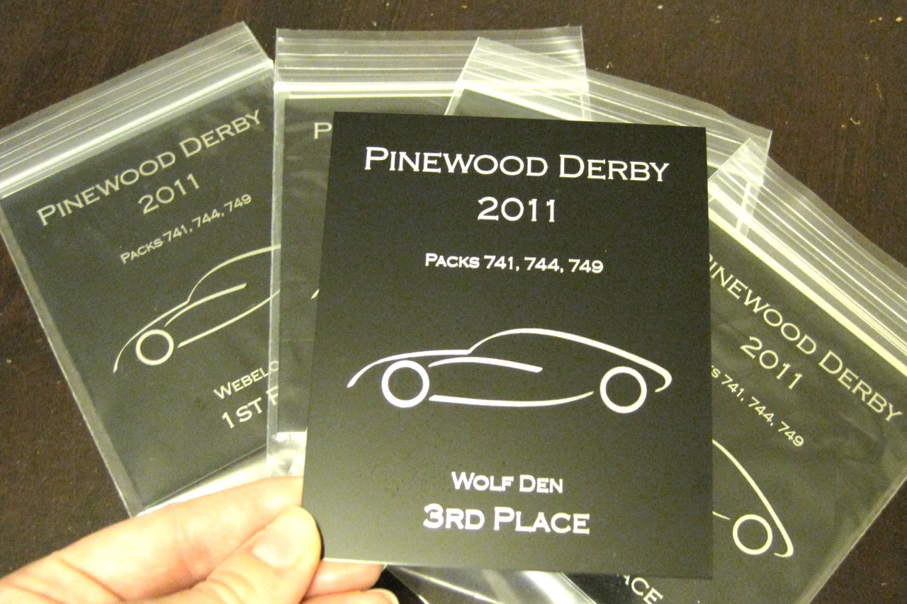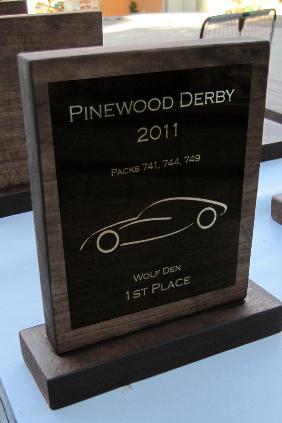 I don’t have a picture for the nameplates that I have put on the ARROW OF LIGHT awards, but they look just like these but smaller. I attach the name plates under the arrow. As for the TROPHIES, I ordered 10 nameplates (1st, 2nd, and 3rd place for the Wolf, Bear, and Webelo Dens, and a Best-In-Show).