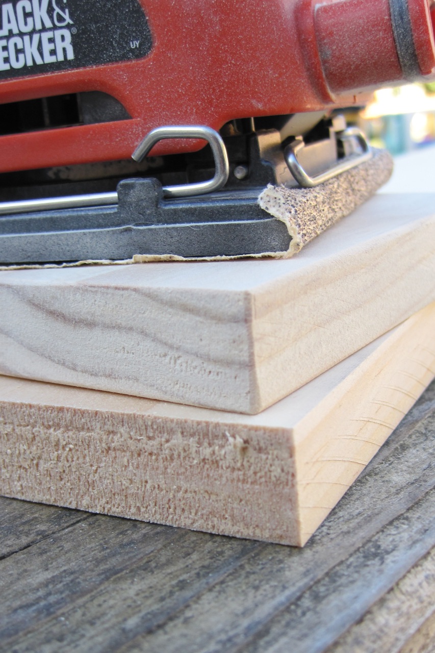 Next, use your power sander (with coarse paper) to soften all the edges. Notice the difference between the top and bottom pieces!