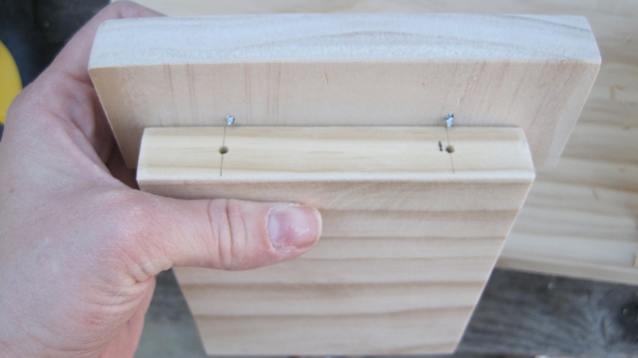 TROPHIES: Drill holes for your screws in the main (on the 4 1/2″side) and base pieces (on the large flat side). Screw your screws in the base pieces just until they poke out a little – this makes it easy to match up the holes to the main pieces. Now you can screw the screws through both pieces together.
