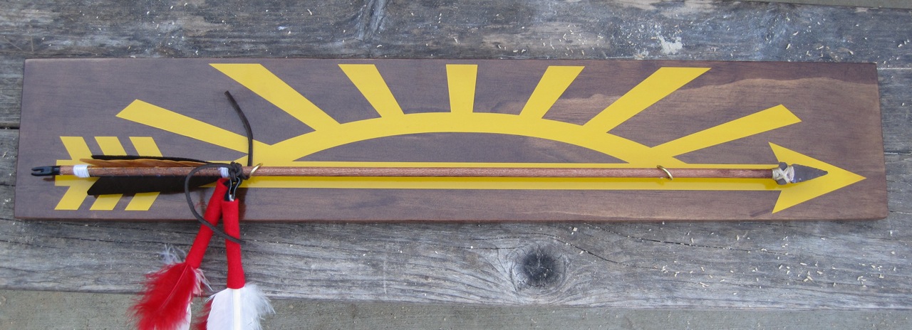 ARROW OF LIGHT: Assemble your arrow kit (you can buy at the Scout Office) and place over cup hooks. Turn the cup hooks inward so they clamp down on the arrow to prevent it from shifting around.