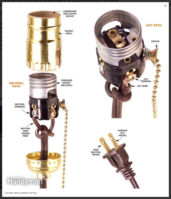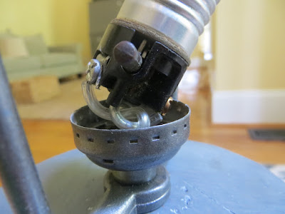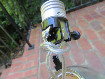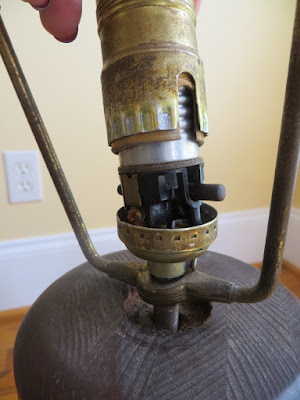 Make sure your lamp is unplugged before disassembling the light socket! Take the light bulb out, unscrew any bolts that are tightening the socket at the lamp base (mine was inside the neck of the glass bottom), slide off cover that goes around the socket (not pictured), pull down the bottom cover of socket to expose wires.