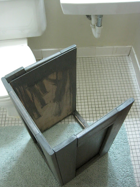 I had a solution! All I can say now is, “Why didn’t I do this sooner!?” This faux sink cabinet adds structure and appeals to the eye. It pulls away easily for cleaning – and is a great place to hide things you don’t want seen (the toilet brush and plunger, perhaps?)! The wood cost less than $15 and I simply stained with Minwax Gray (my fav lately) and put a coat of Poly to protect.