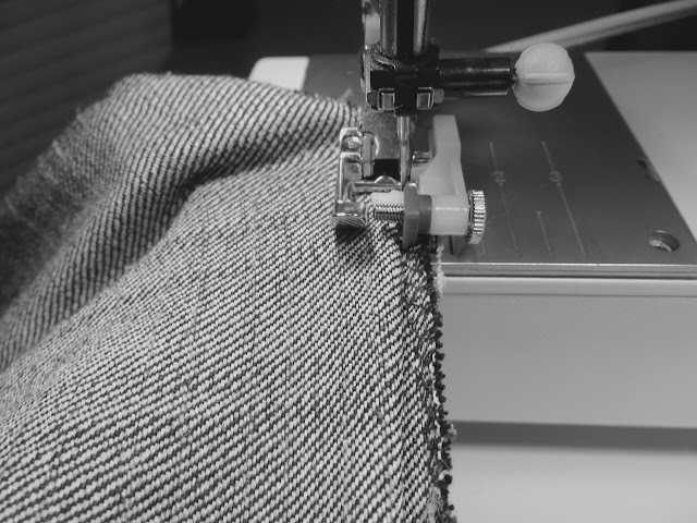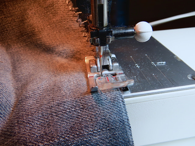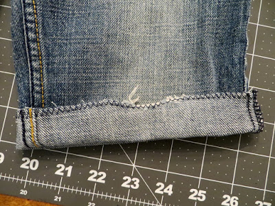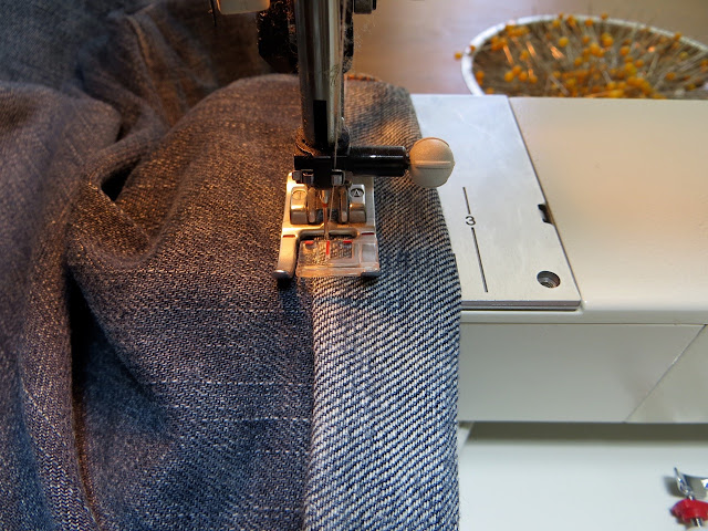 This stitch is easy but a little confusing to explain (perhaps look up a video). Essentially you’re sewing the hem from the INSIDE by stitching along the top of the raw edge and having the ‘zigzag’ part of the stitch so it barely nips into your pant fabric (this creates the “blind” look because you get one little tack every 1/2″ or so. I pinned my cuff along the fold in the previous step so I can keep the pins in place while I sew around.