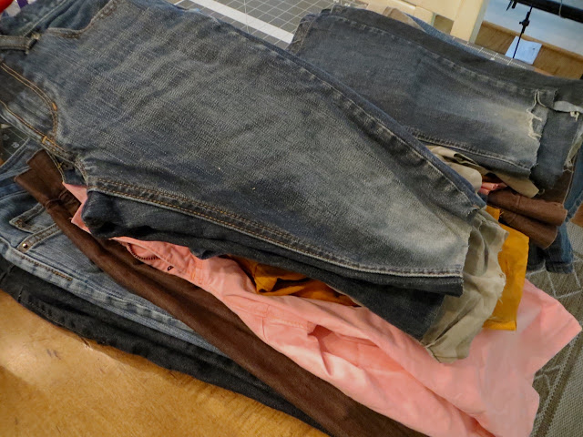 Pre-wash to shrink before altering any clothing. On the picture above I’m showing with my fingers where I want the final hem to be. The pin is a few inches down showing where I need to cut the legs for my hem.