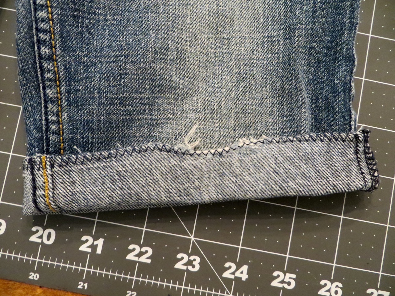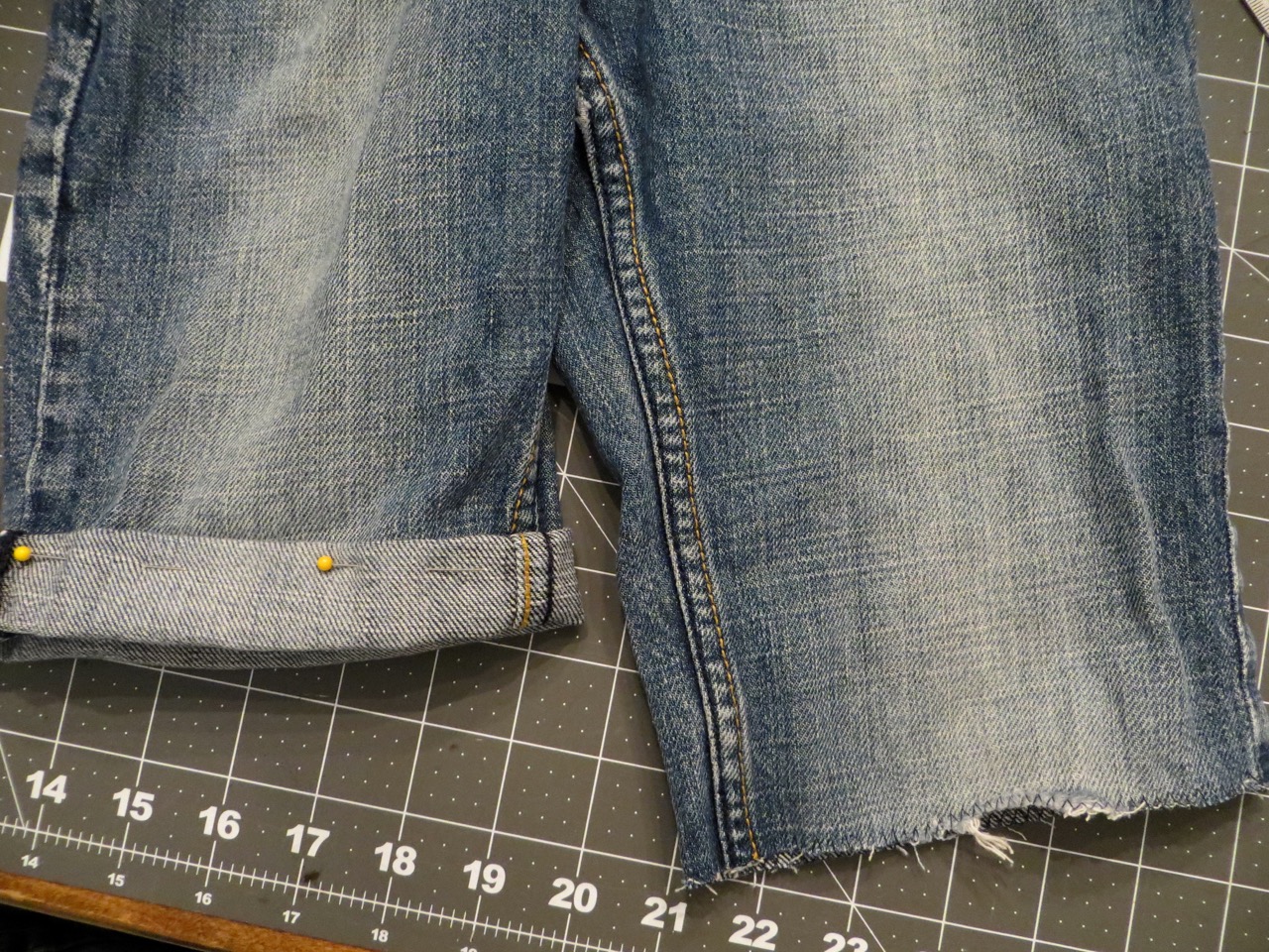Here I’m trying to decide between a regular hem and a cuff. I’m going to go for the regular on these shorts and add some pleats after hemming so they’re not so baggy.