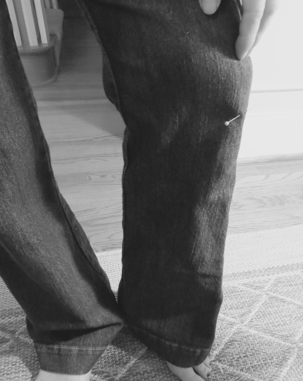 Pre-wash to shrink before altering any clothing. On the picture above I’m showing with my fingers where I want the final hem to be. The pin is a few inches down showing where I need to cut the legs for my hem.