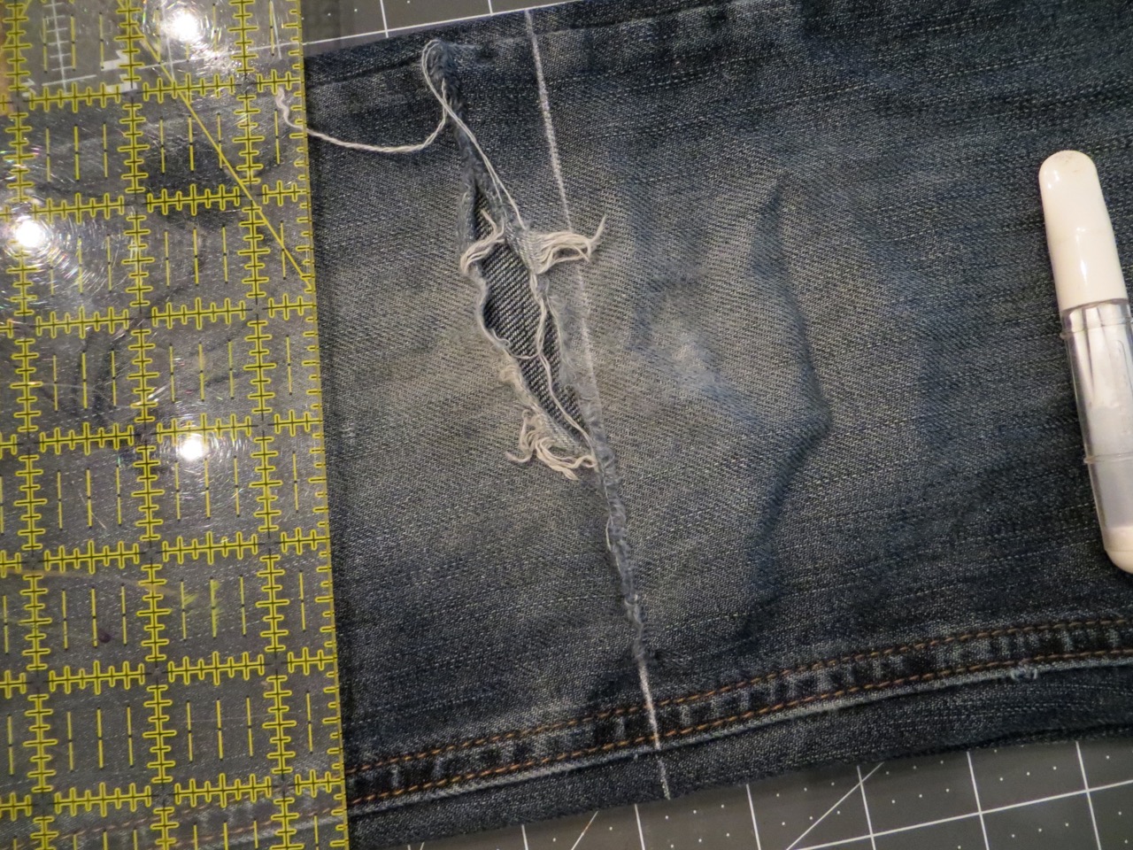 You’ll want to cut just above the hole on the knee. Use a straight edge to mark a line.