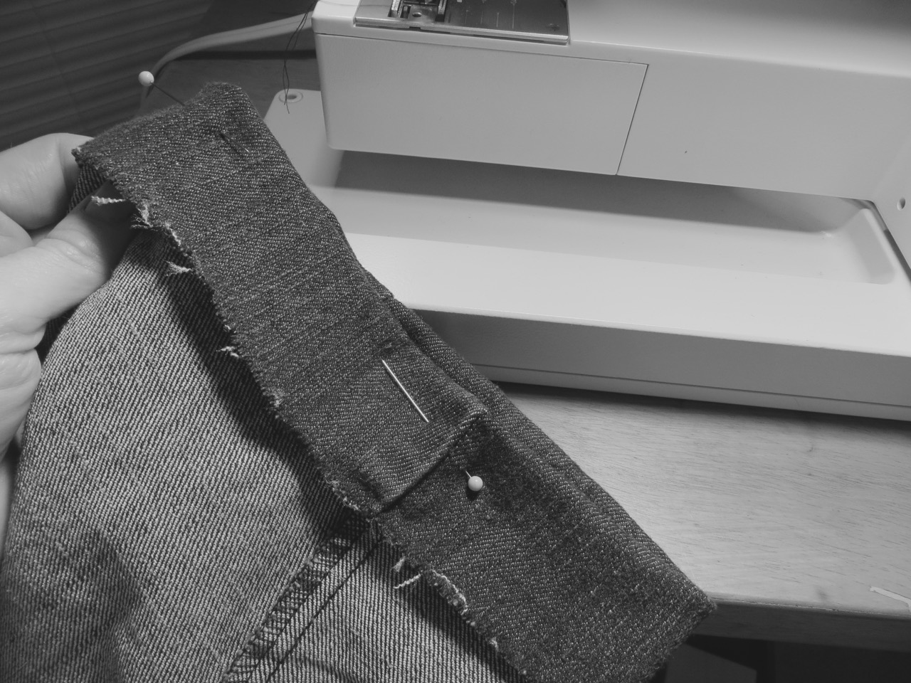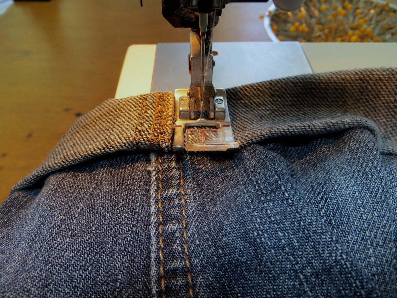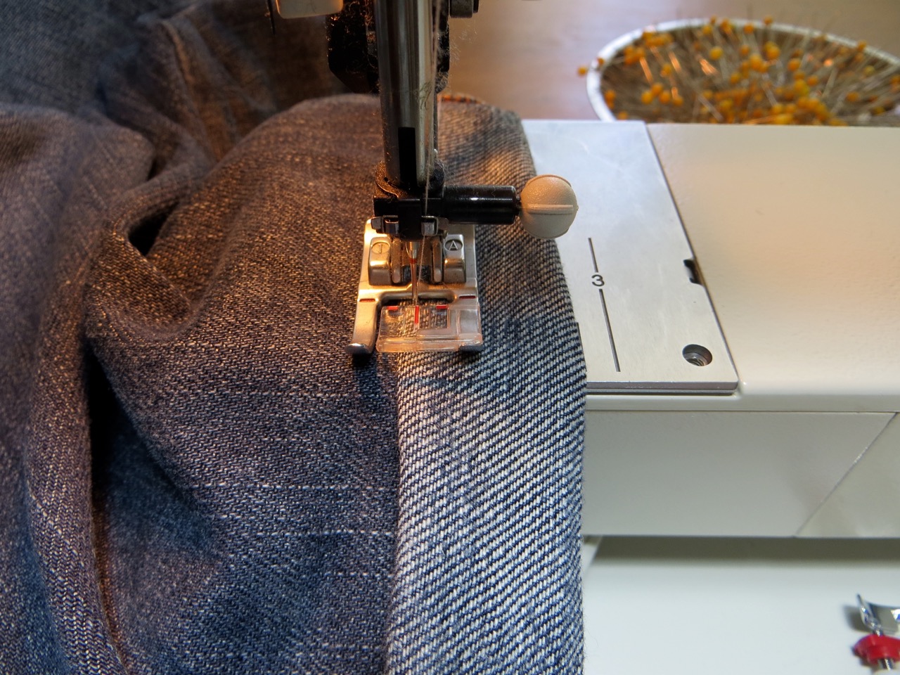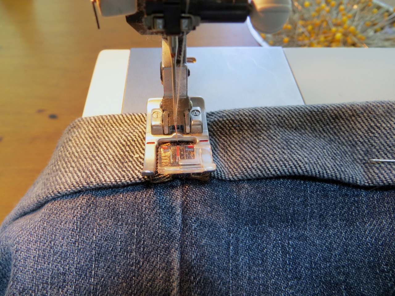 This stitch is easy but a little confusing to explain (perhaps look up a video). Essentially you’re sewing the hem from the INSIDE by stitching along the top of the raw edge and having the ‘zigzag’ part of the stitch so it barely nips into your pant fabric (this creates the “blind” look because you get one little tack every 1/2″ or so. I pinned my cuff along the fold in the previous step so I can keep the pins in place while I sew around.