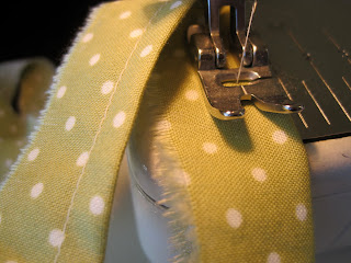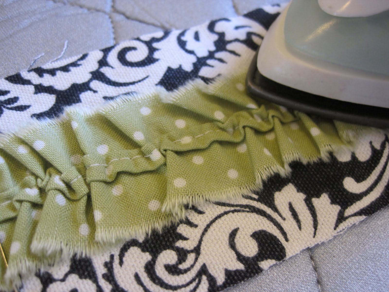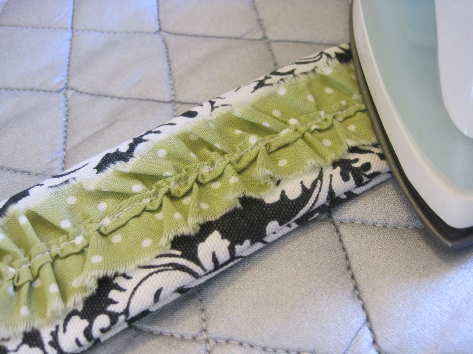 Iron ruffle down flat. This is fastest and easiest with a steam iron! Then sew along the center (over your gathering stitch) of your ruffle to tack it in place.