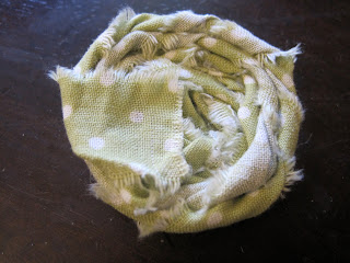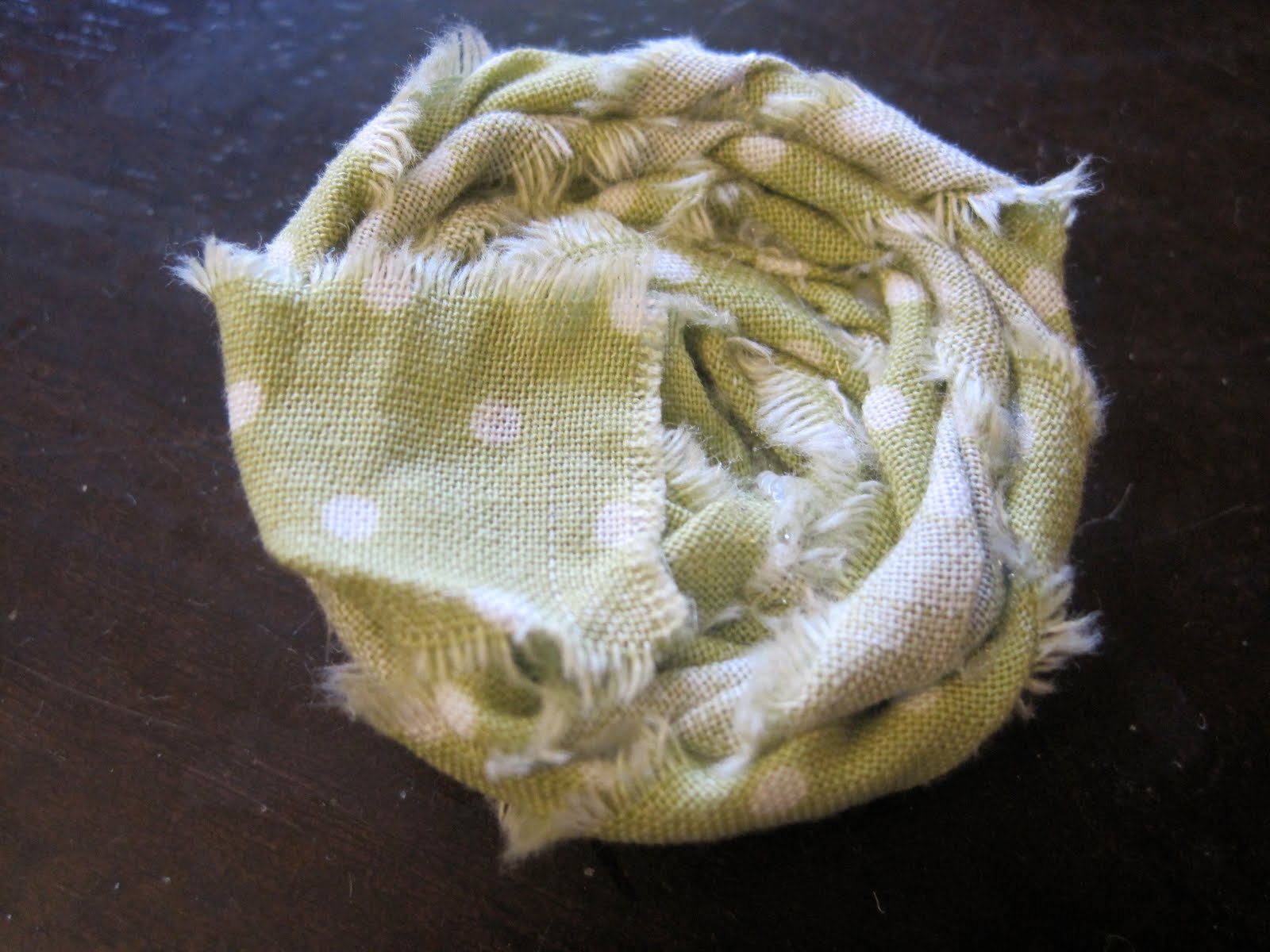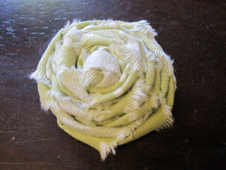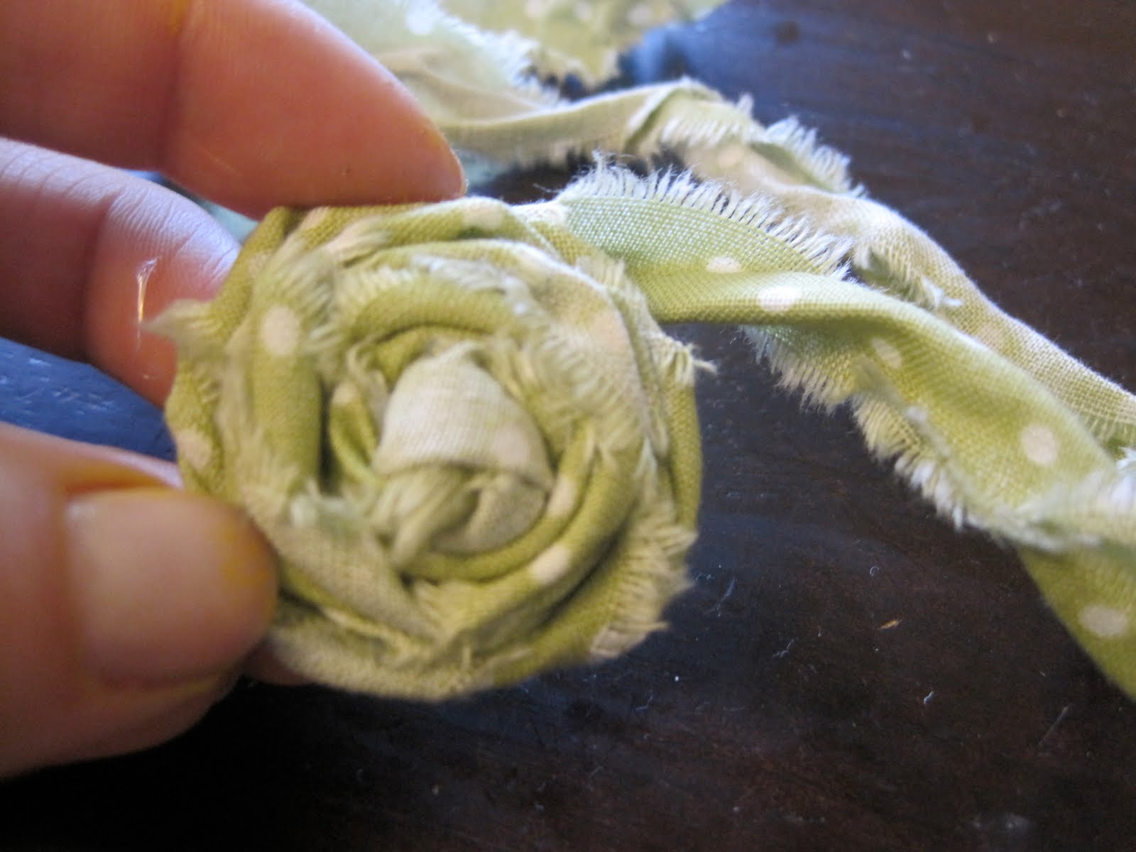 You’ll create your flower rosette by twisting your strip of material while rolling it around your knot. Dab it with hot glue every so often to hold it all together.