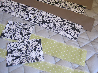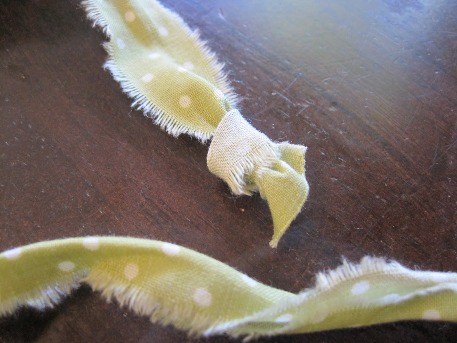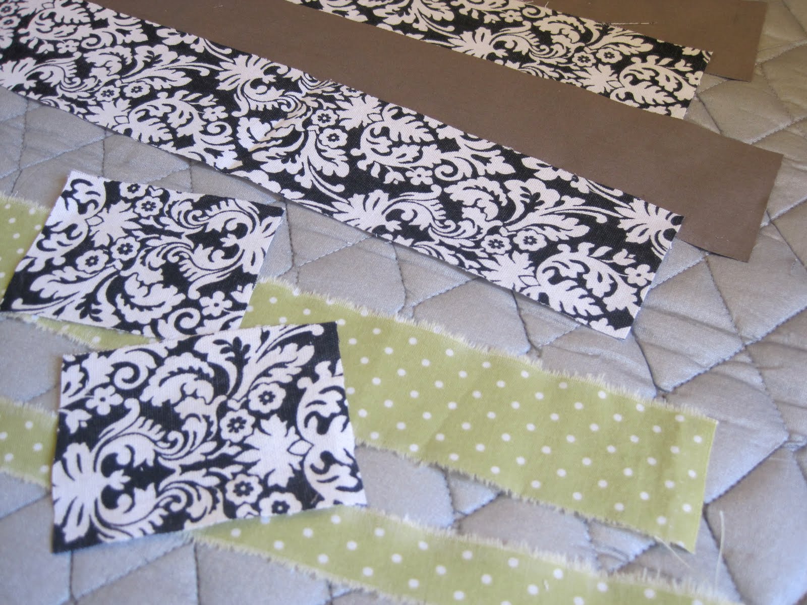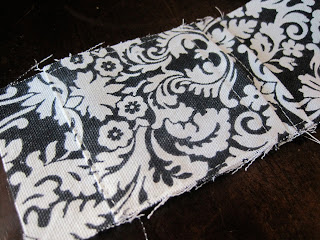 For your ruffle and flower, rip a 2-inch and 1-inch strip down the width of your fabric. To do this, just cut a little into the edge of your fabric and pull the two pieces apart. Pull off any stray threads. Cut these two strips to 38-inches long. Iron flat.