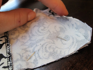 Pull on one of the threads on one end and hold onto it firmly while you slide the material down. Do this for both sides. You’ll want to fit your ruffle (with ends tucked under 1/4-inch) onto one of your main fabric pieces and have it 1 1/4-inches away from each end. Pin in place along the entire length.
