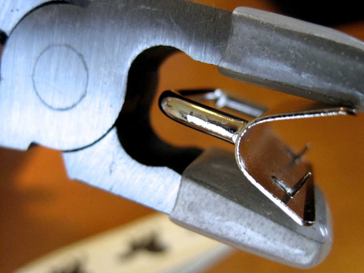 *If you don’t have a set of glass pliers with wide rubber tips (most likely not), you can use regular pliers but you’ll want to put something long, flat & skinny (like popsicle sticks) between your metal clamp and pliers to prevent pliers from making crimp marks on your metal hardware.