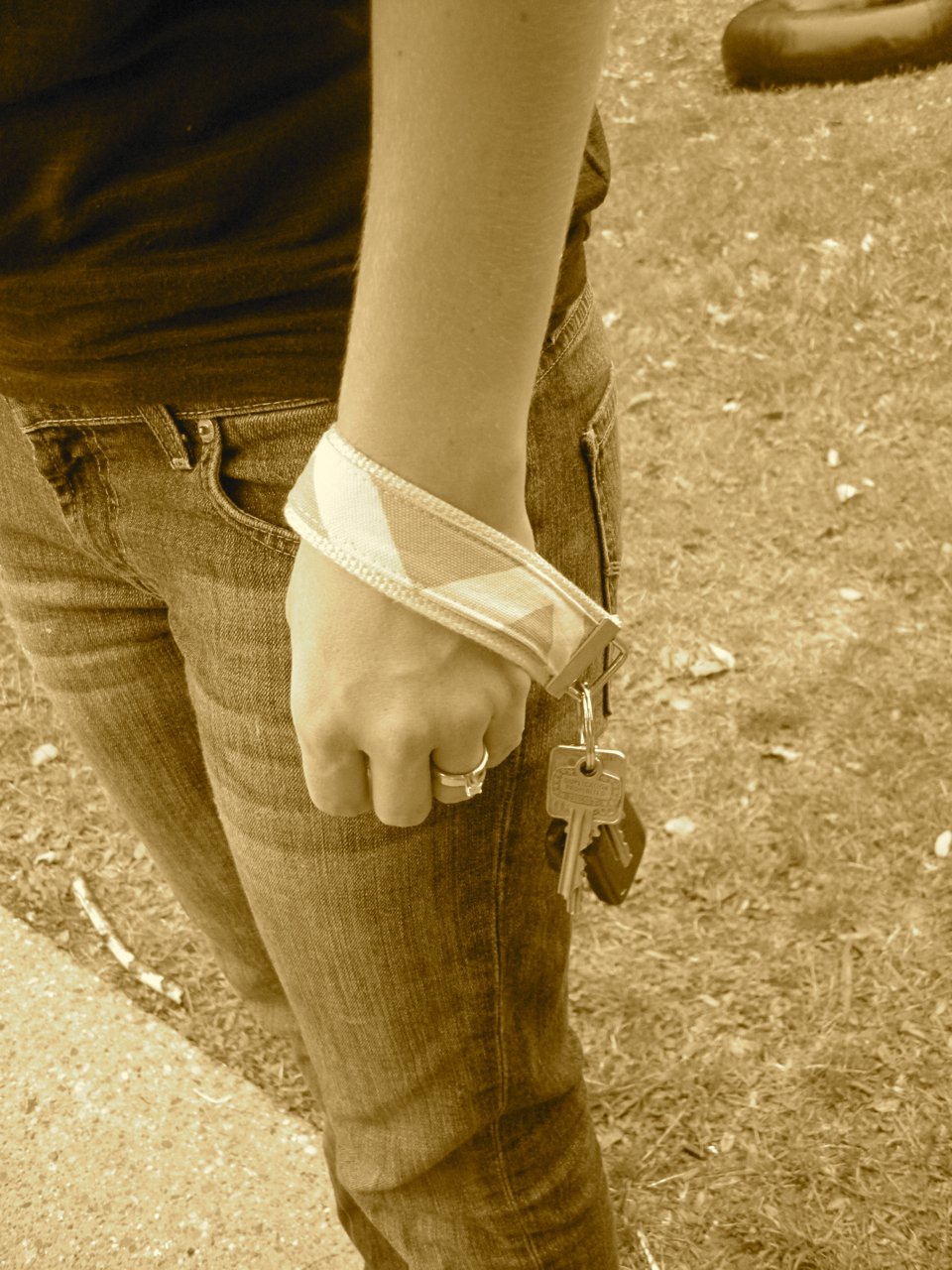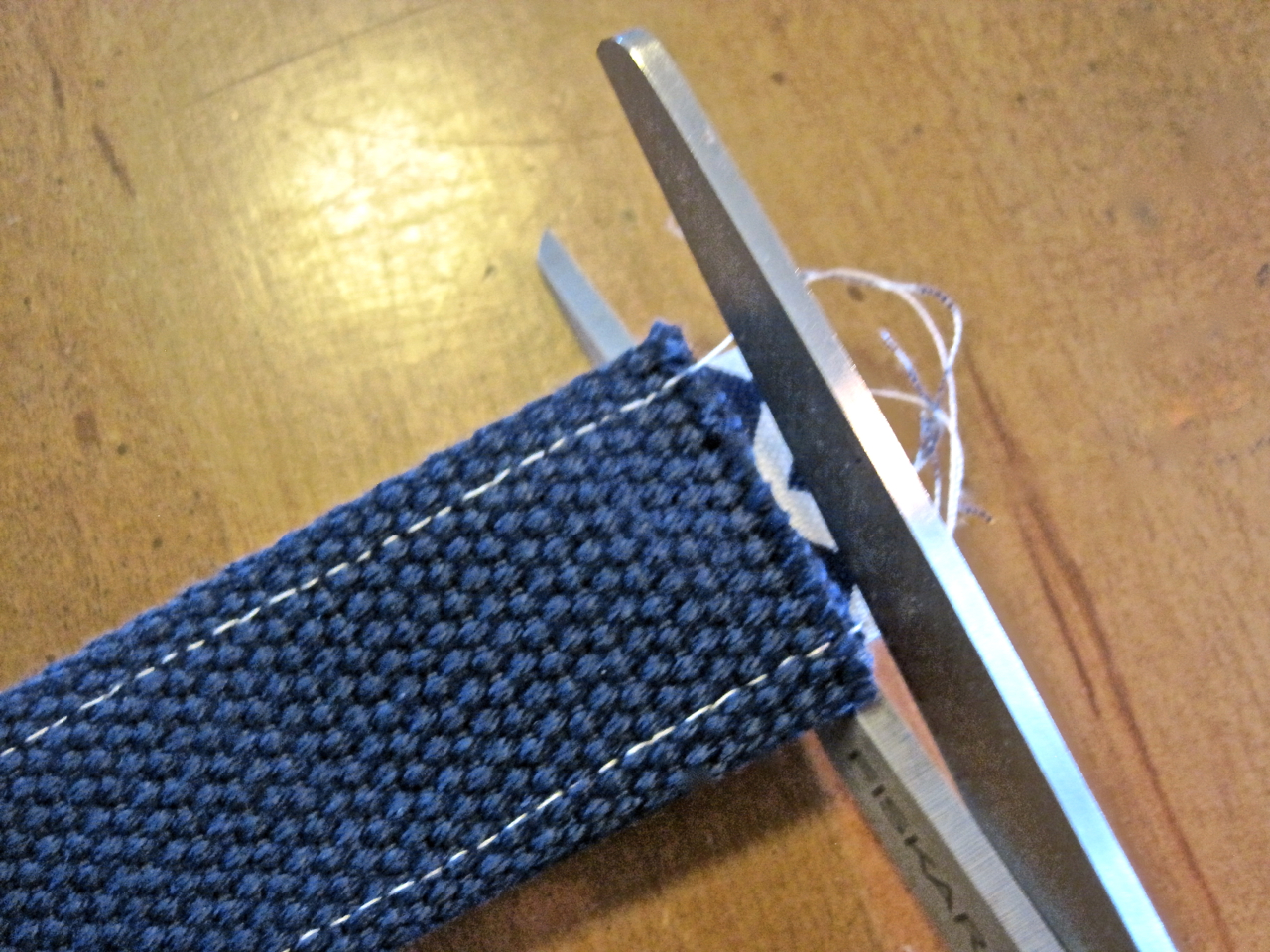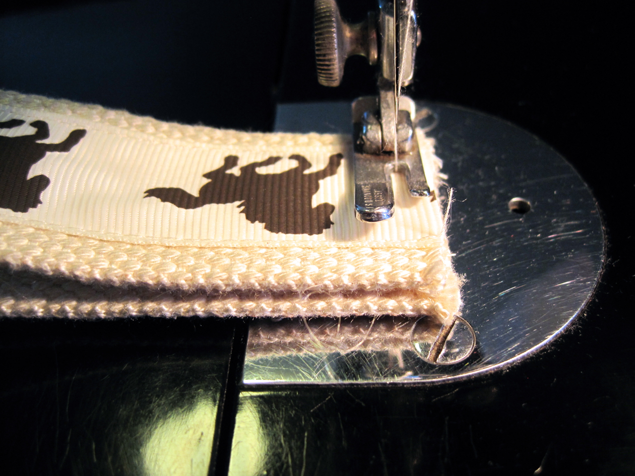Fold your webbing in half with raw ends even. Stitch* ends together ¼” from raw edges just over the fabric or ribbon (you don’t need to go across the WHOLE webbing).