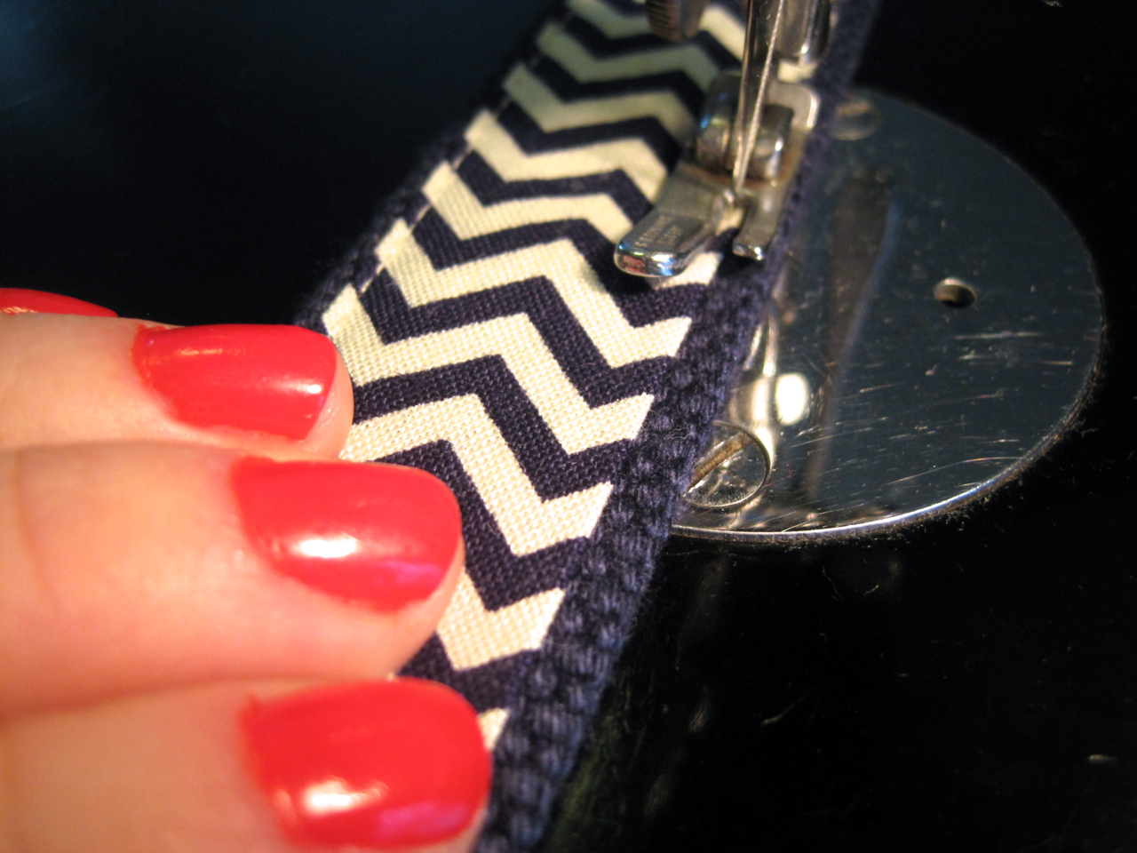 Center your fabric strip or ribbon on webbing. Carefully stitch down one side (close to the edge) of your fabric or ribbon. Stitch on the other side.