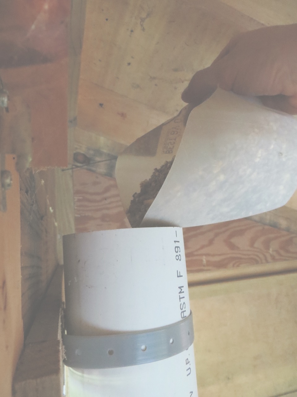 The pipe is tall enough that I can’t see inside (or rather I don’t want to try and get spider webs in my hair). I made a larger scoop from a 1-gallon milk jug and it works wonderful – it bends so the sides are closer together and I get less spilling.