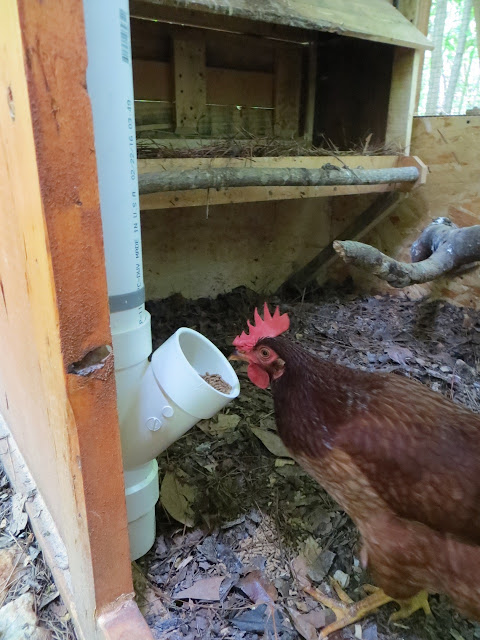 I’ll start off by saying it’s important to have your feeder high enough for the chickens to reach their heads in but not be able to push food out with their beaks.