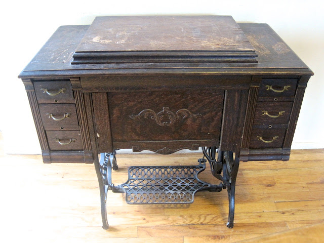 I saw this treadle at a re-use store today, looked at it for a few minutes and decided to walk around the store for a few minutes to decide if I would get it. The moment I saw someone else look at it – game on! I wasn’t going to let this slip out of my grasp even though it was more than what I usually pay. As I was paying 2 other people stooped down to check it out and were disappointed to hear that it was sold. As I was loading it in my vehicle another couple stopped to say, “Good find”! It is a good find. I’ve never heard of “The Eldredge” company, but this is practically identical to my other “Sears” treadle. The machine has a layer of dust and some rust but mechanically sound and cosmetically in fine condition. It comes with the attachment set and manual. The cabinet is also great. A little more ornate then what I prefer but nothing is broken and just needs a face lift.