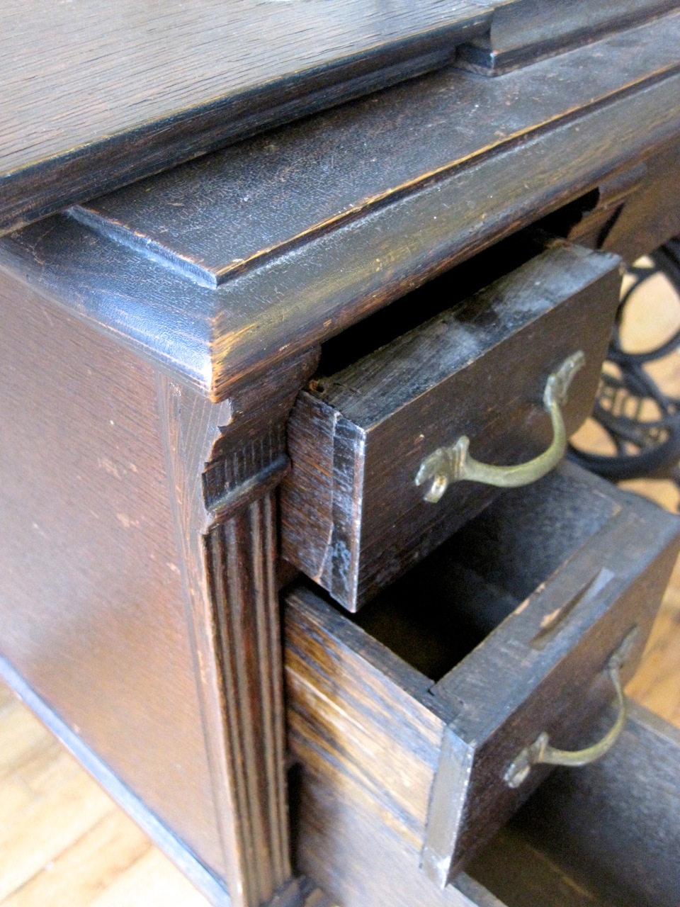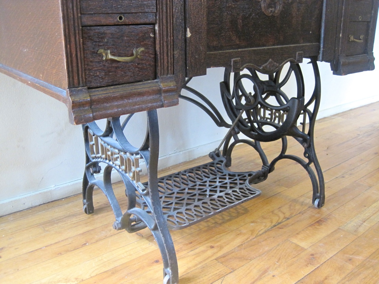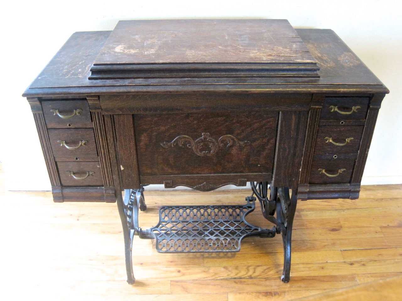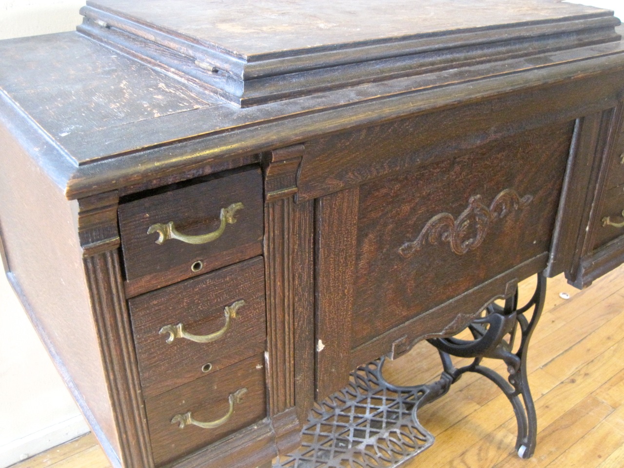 I saw this treadle at a re-use store today, looked at it for a few minutes and decided to walk around the store for a few minutes to decide if I would get it. The moment I saw someone else look at it – game on! I wasn’t going to let this slip out of my grasp even though it was more than what I usually pay. As I was paying 2 other people stooped down to check it out and were disappointed to hear that it was sold. As I was loading it in my vehicle another couple stopped to say, “Good find”! It is a good find. I’ve never heard of “The Eldredge” company, but this is practically identical to my other “Sears” treadle. The machine has a layer of dust and some rust but mechanically sound and cosmetically in fine condition. It comes with the attachment set and manual. The cabinet is also great. A little more ornate then what I prefer but nothing is broken and just needs a face lift.