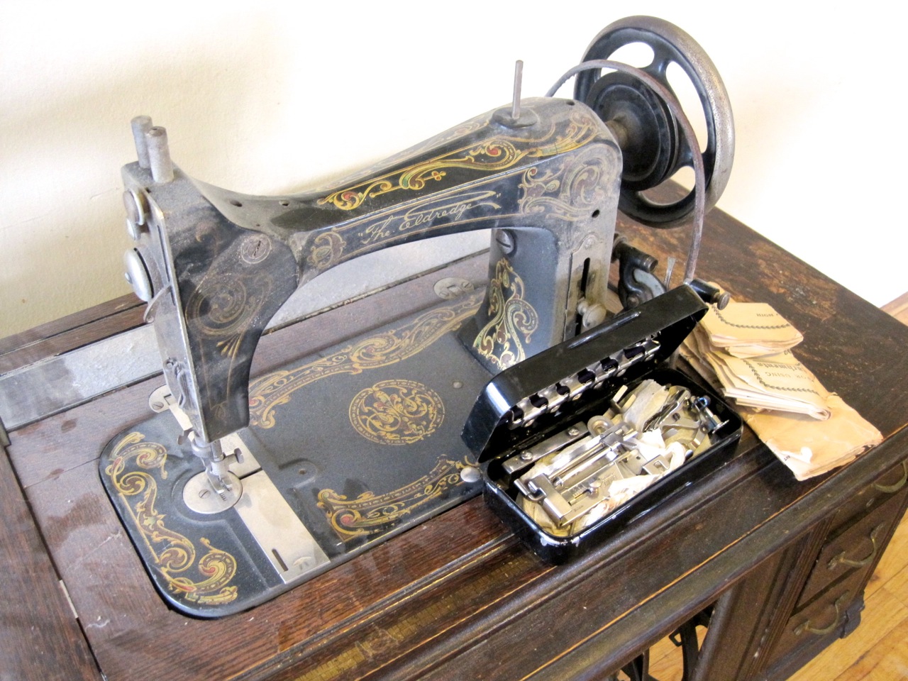 I saw this treadle at a re-use store today, looked at it for a few minutes and decided to walk around the store for a few minutes to decide if I would get it.  The moment I saw someone else look at it – game on!  I wasn’t going to let this slip out of my grasp even though it was more than what I usually pay.  As I was paying 2 other people stooped down to check it out and were disappointed to hear that it was sold.  As I was loading it in my vehicle another couple stopped to say, “Good find”!  It is a good find.  I’ve never heard of “The Eldredge” company, but this is practically identical to my other “Sears” treadle.  The machine has a layer of dust and some rust but mechanically sound and cosmetically in fine condition.  It comes with the attachment set and manual.  The cabinet is also great.  A little more ornate then what I prefer but nothing is broken and just needs a face lift.