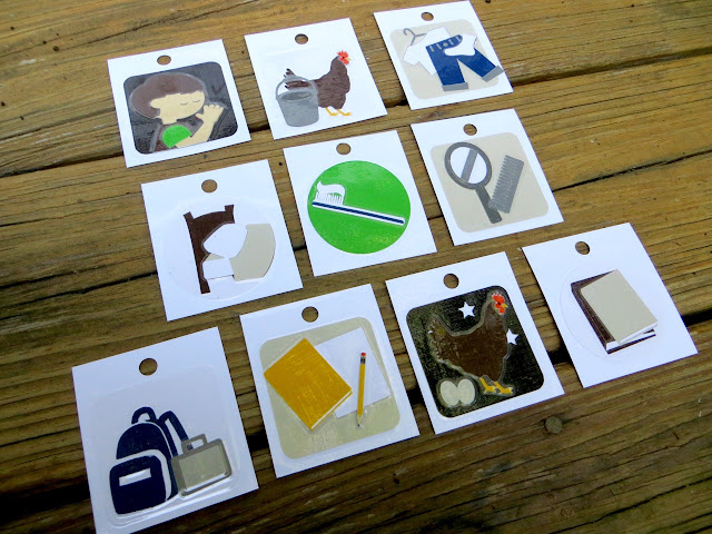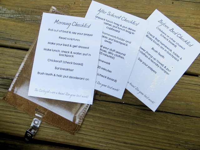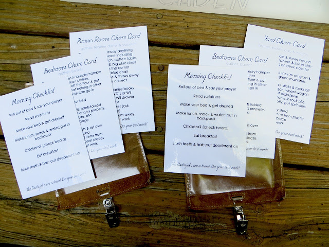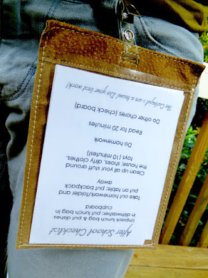 The leather pouches clip onto their pants/shirt and they can look down easily to see what they need to do next.  During the week I keep the 3 checklist cards (above) inside and rotate throughout the day.
