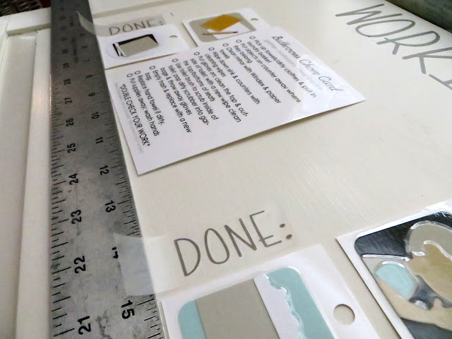 I used my job cards & checklists to layout over my board (did I mention it’s a salvaged cupboard door!?) and used a ruler to make sure everything was straight before deciding where to put my vinyl.