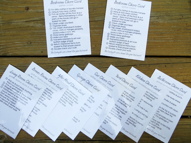 This is what a typical weekend looks like.  I always have each of them do their bedroom (so I have one card for each; and only 1 of each of the other chore cards).