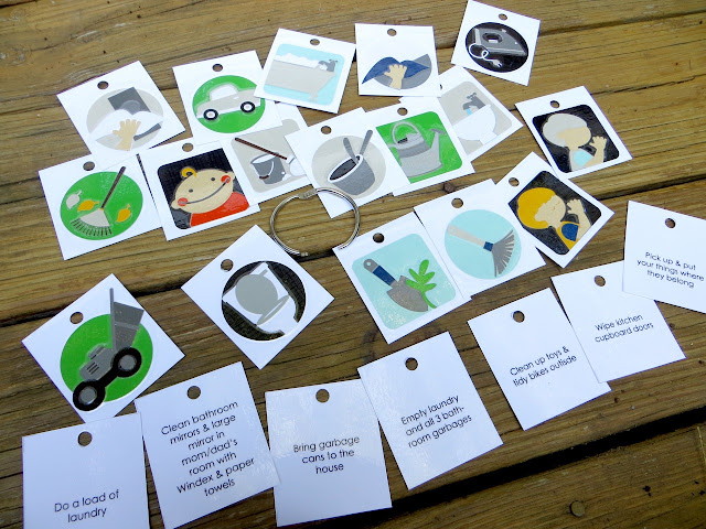 My 5-year-old has his daily tasks on the smaller cards with pictures and will have 2 chores mixed in as well.