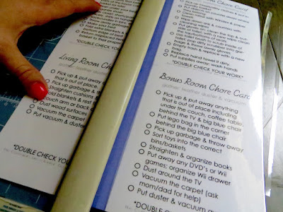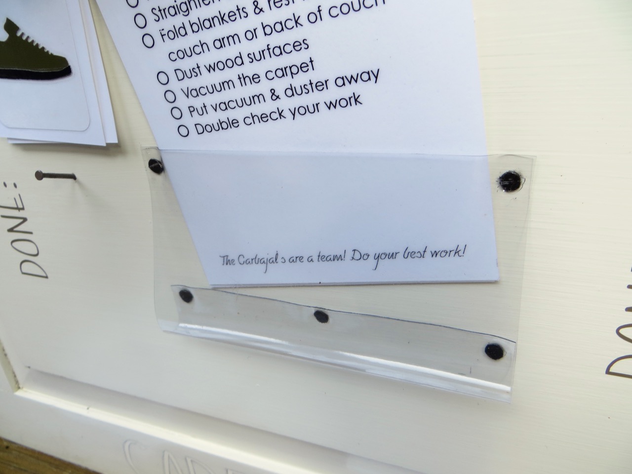 These are the large chore cards with step-by-step instructions for them to follow and check off with a dry erase marker.  The last step is “Double check your work” (we’re still working on them following through with each step and making sure it’s done correctly the first time).