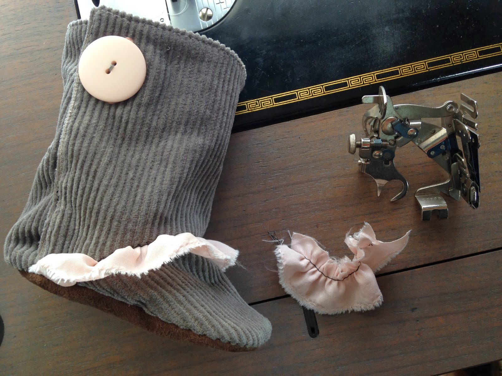 These corduroy boots have a ruffle detail. I used a strip of chiffon fabric and fed it through my sweet ruffler attachment that makes perfect ruffles in seconds.