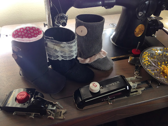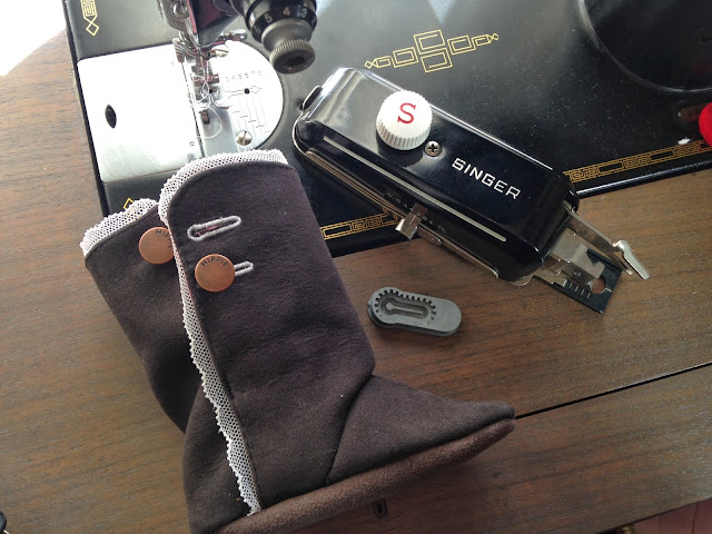 I made these boots out of a man-made suede and trimmed the edge with a little white ruffle. I used jean-tack buttons for the closure. I used my buttonhole maker for these key-hole buttons. This old Singer 201-2 I’m using is just straight stitch but you can use these buttonhole attachments that have different templates and they make perfect buttonholes every time (even more perfect than a new $7,000 modern machine).