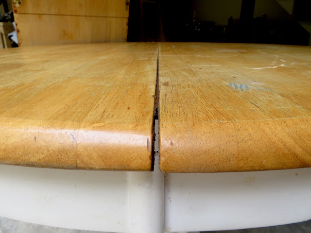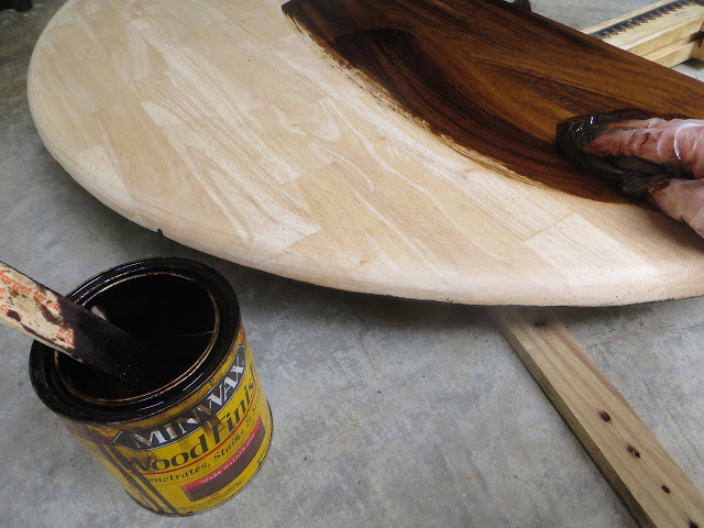 Here’s the stain on the table top. Notice the right side is back to bare wood but with dark pores from my little mishap – oops!