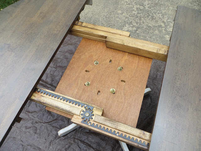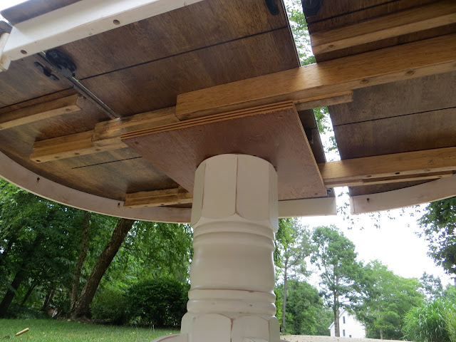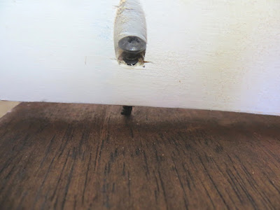 Once the stain was dry I assembled the table back together. The easiest way was to have the trim pieces lifted so I could guide the screws back into the right hole on the table top.