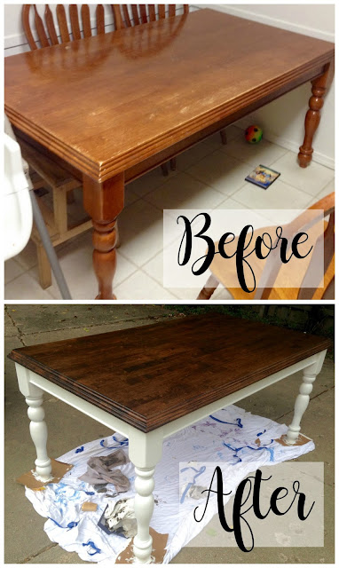 Here’s another example of a table refinish! Isn’t it amazing!? I helped a friend a few years ago and it took us about 2 hours of sanding and cleaning to prepare for paint and stain. We used two coats of white latex paint for the legs and Minwax Dark Walnut Stain for the top, and finished it off with a topcoat.
